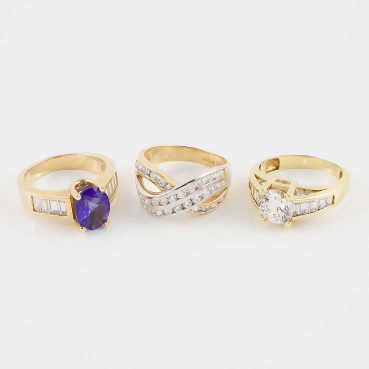 3 X 14K YELLOW GOLD RINGS set with synthetic stones, 22.5 grams, size 8 & 9