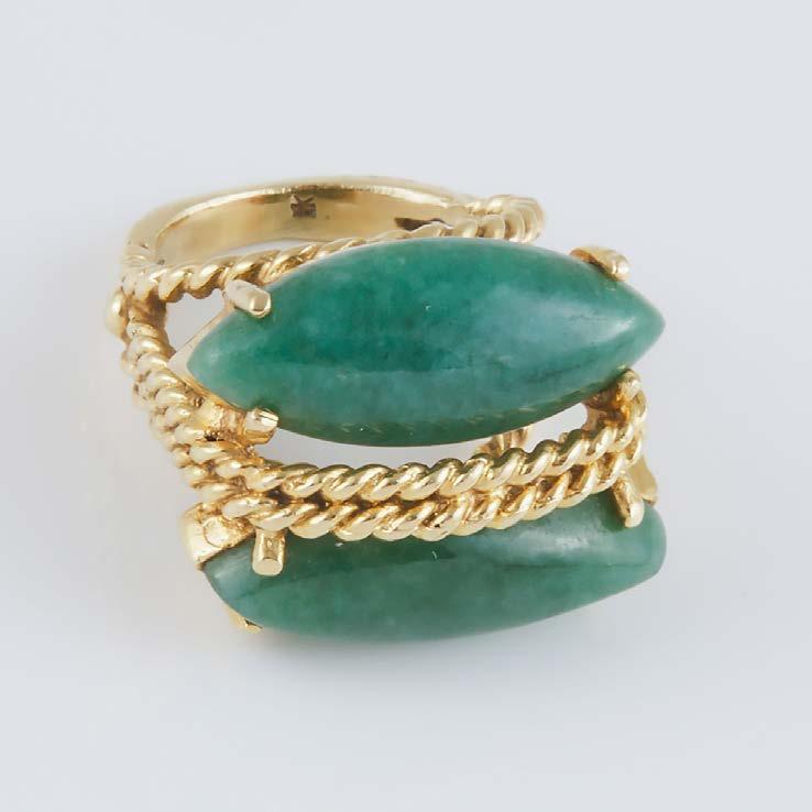 with a double ram’s head design, and set with 18 small rose cut diamonds and 10 small full cut emeralds, inner dia. at widest 2.2”, 35.4 grams $1,700 — 2,400