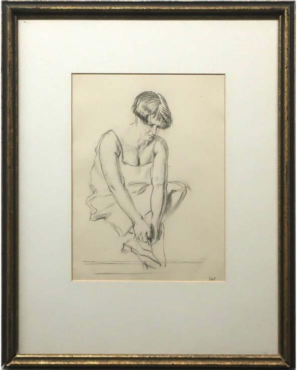 UNTITLED (WOMAN TYING HER SHOE) GRAPHITE DRAWING; INITIALED LOWER RIGHT