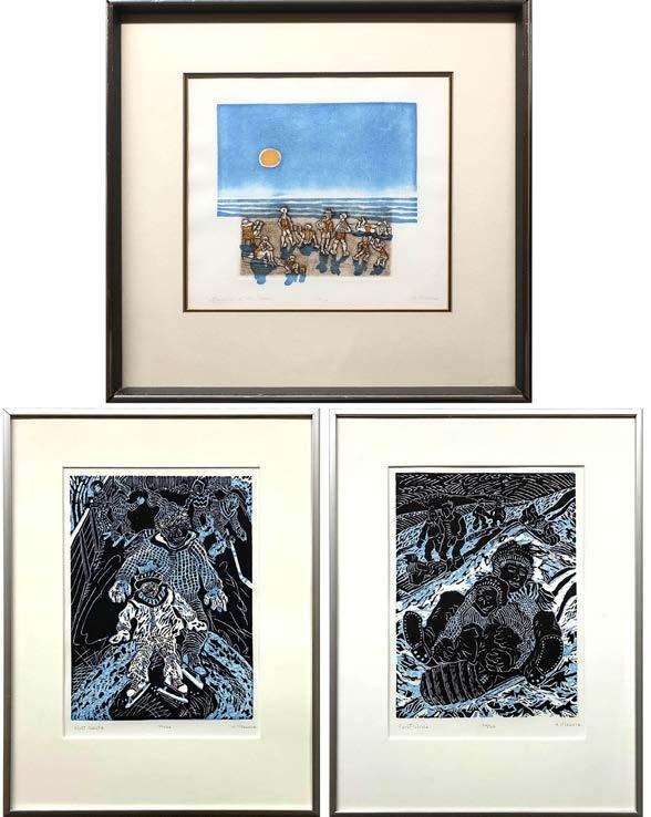 AFTERNOON AT THE BEACH; FIRST SKATE; FIRST SLIDE THREE WORKS: FORMER - COLOUR ETCHING; SIGNED, TITLED AND NUMBERED 24/50 IN PENCIL; LATTER - PAIR OF COLOUR WOODBLOCKS