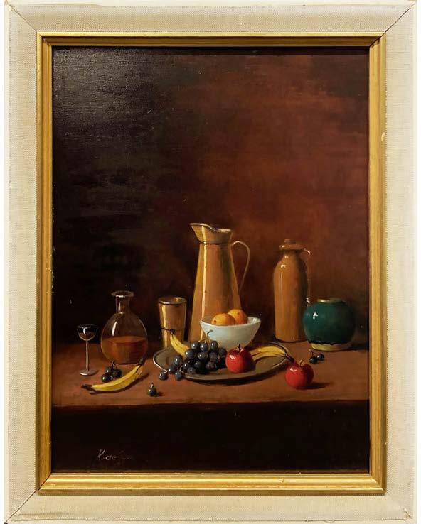 K. DE JONG (DUTCH, 20TH CENTURY) UNTITLED (STILL LIFE ON TABLE) OIL ON HARDBOARD; SIGNED LOWER LEFT