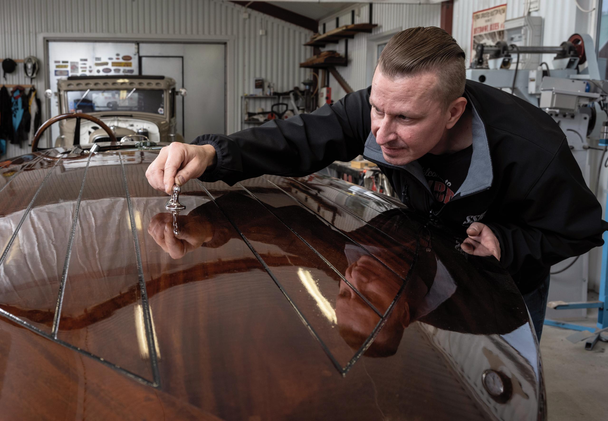 Jag har valt att specialisera mig på att bygga Hot-Rods och det är ett resultat av mitt brin nande motorintresse sedan unga år. Motorcross, moped, motorcykel, ja, det började ganska tidigt och sedan har det nog eskalerat en del, berättar Mikael med ett leende samtidigt som vi blickar in i kupén till en Ford 32.
