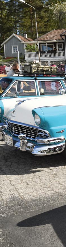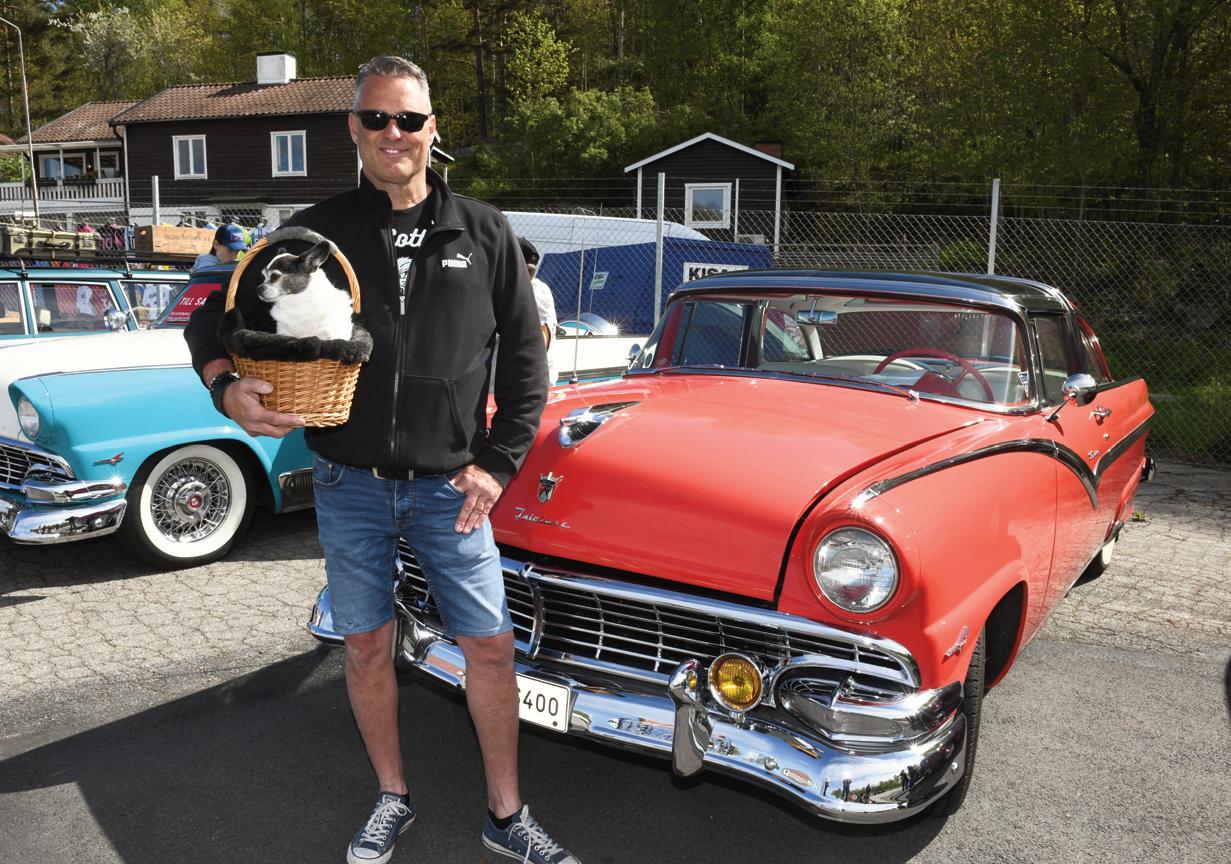 Mikael Rydhage med två av familjens ögonstenar två Ford 1956-or. Den blå bilen Crown Victoria 64B ”Skyliner” importerade 1990 till Sverige från USA av Jerry Williams.