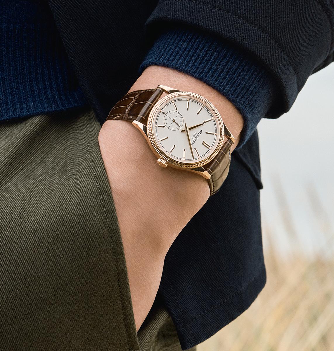 The self-winding caliber 26-330 S C movement powers the hours, minutes, central seconds, aperture-type date and stop-seconds mechanism and has a reserve of 35 to 45 hours. Waterproof to 30 meters, this piece is presented with two interchangeable straps: beige calfskin with a nubuck finish and black calfskin with an embossed fabric motif and beige topstitching, both with a prong buckle. Elegant in every respect, the Reference 5226 Calatrava is truly a work of art.
