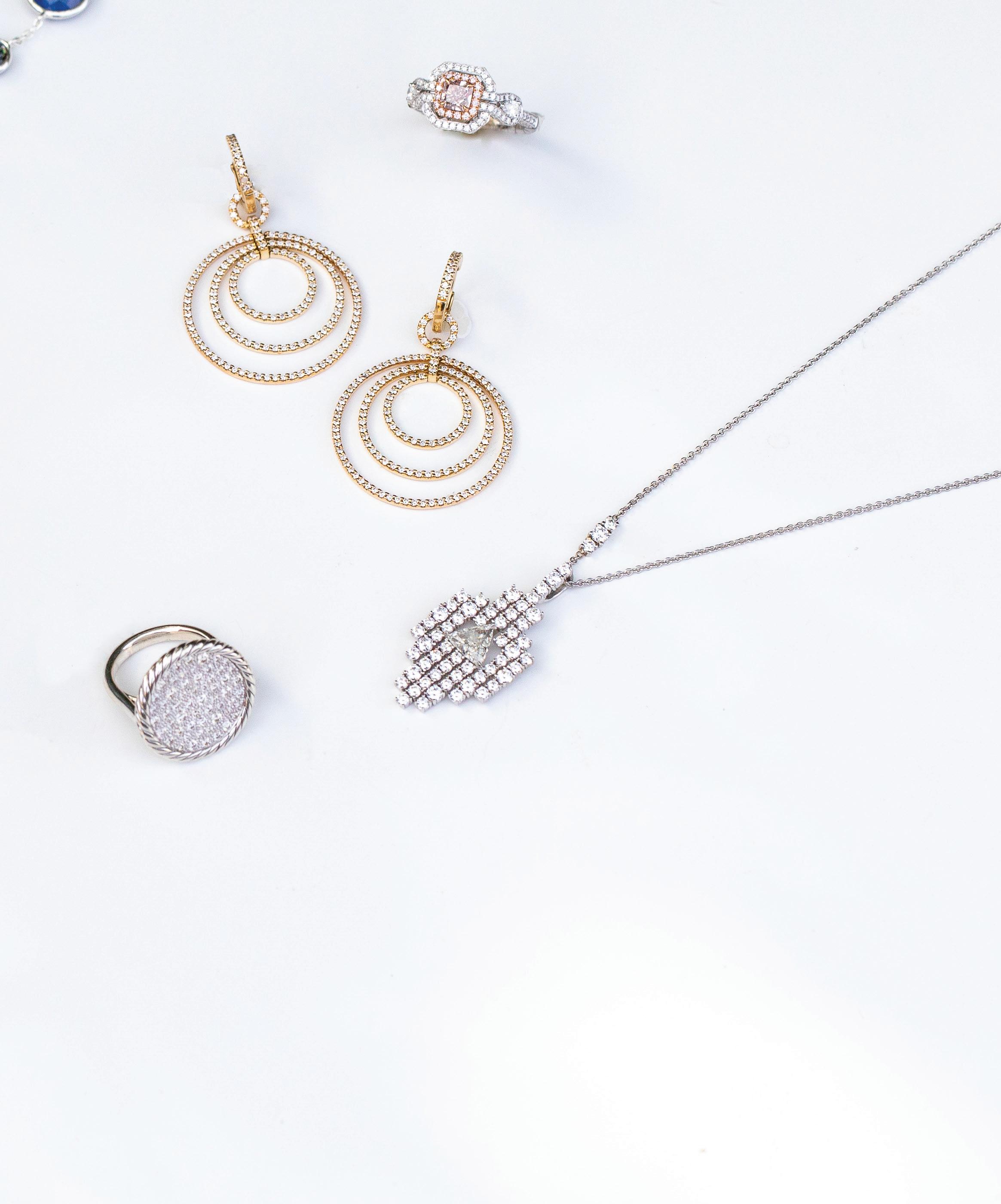 KWIAT PINK & WHITE OVAL DIAMOND NECKLACE $863,000 CÉLESTE LAB-GROWN DIAMOND TENNIS BRACELET TOTALING 25.70CT $86,390 CHRISTOPHER DESIGNS 3 STONE DIAMOND RING $235,650 DIAMOND CELLAR DIAMOND STUDS TOTALING 8.0CT $166,400