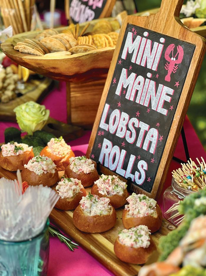Above: A fresh, seasonal bowl featuring blueberries at catchy. Top right: Mini Maine “lobsta” rolls at a catchy. event. Bottom right: Shrimp cocktail on display at a catchy. catered event.