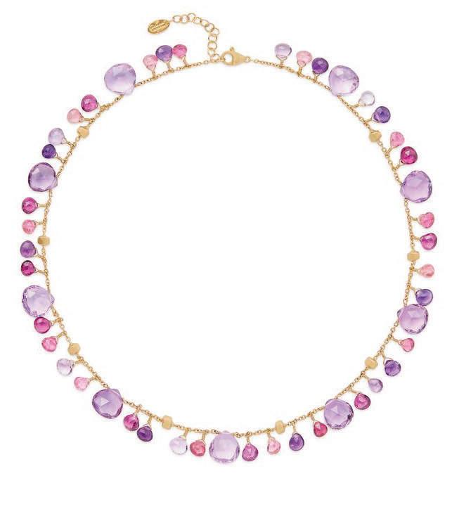 Clockwise from top left: Paradise18K Yellow Gold Earrings with Amethyst and Pink Tourmaline, $1,900; Siviglia 18K Yellow Gold Lariat with Diamond Accents, $6,950; Siviglia 18K Yellow Gold Earrings with Diamond Accents, $3,350; Marrakech 18K Yellow Gold Collar with Diamonds, $21,200; Paradise18K Yellow Gold Necklace with Amethyst and Pink Tourmaline, $6,400; Marrakech 18K Yellow Gold 3-Strand Bangle with Diamonds, $10,500; Siviglia 18K Yellow Gold Ring with Diamond Pavé, $2,500. All prices are subject to change.