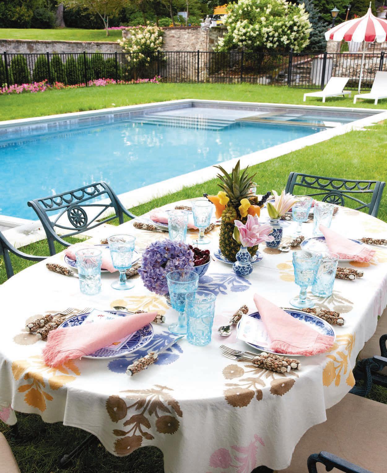 When designing a thoughtful poolside table setting, consider the surroundings. Entertaining expert Stephanie Nass looks to a backyard garden for inspiration, matching a block-printed, mixed-poppy tablecloth with florals blooming on the opposite side of the pool.