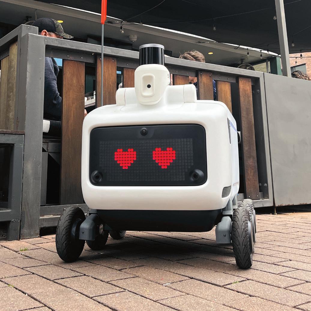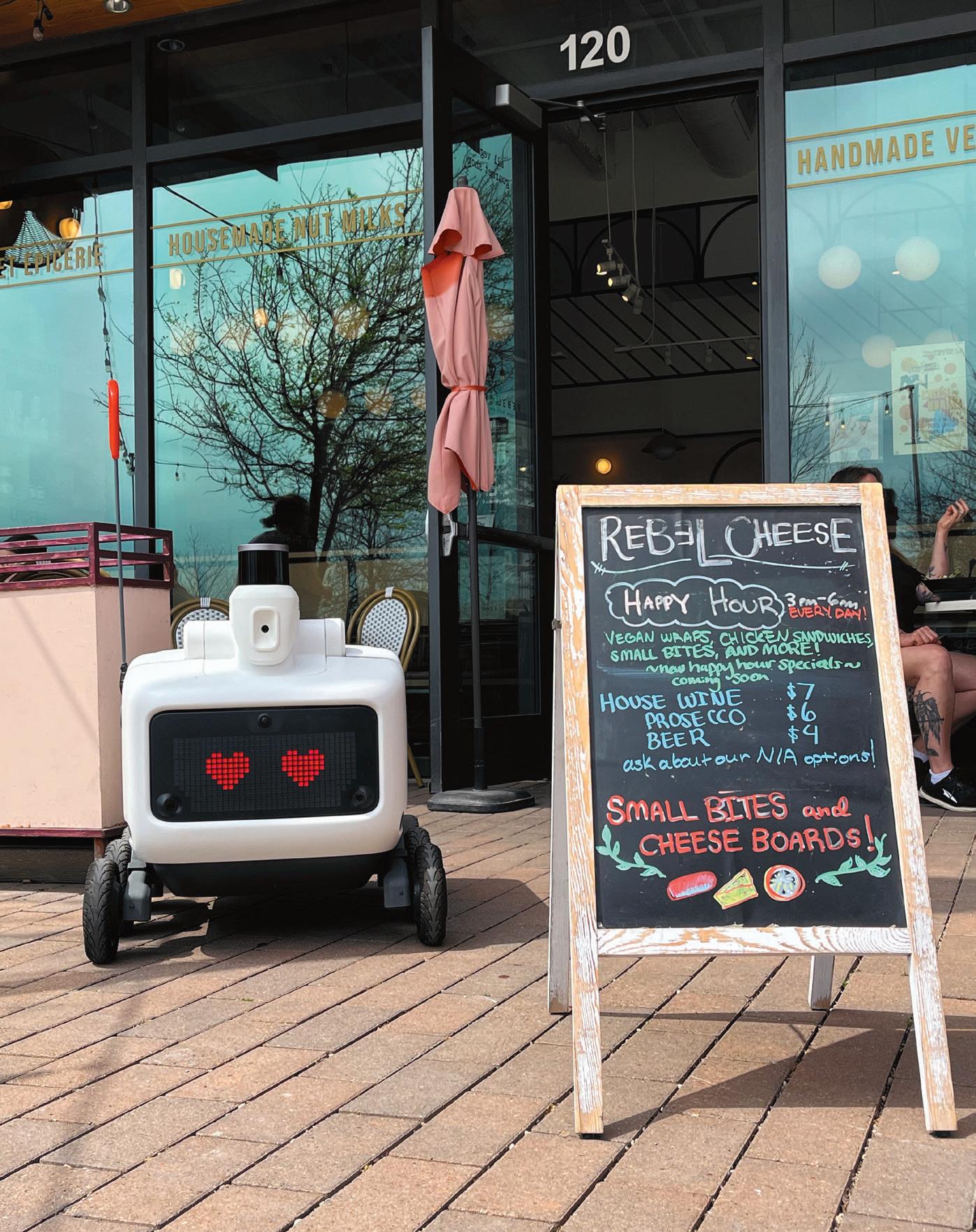 Currently, three local restaurants in Mueller are using robots for their delivery services: Xian Sushi & Noodle, Rebel Cheese and Colleen’s Kitchen. By using the robot service, the restaurants are able to keep deliveries in-house without the need for thirdparty apps. This helps lower delivery costs, which in turn keeps customer costs down.