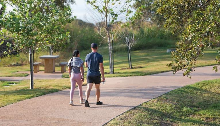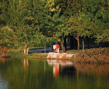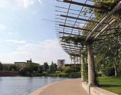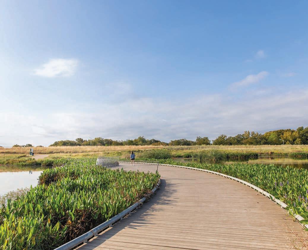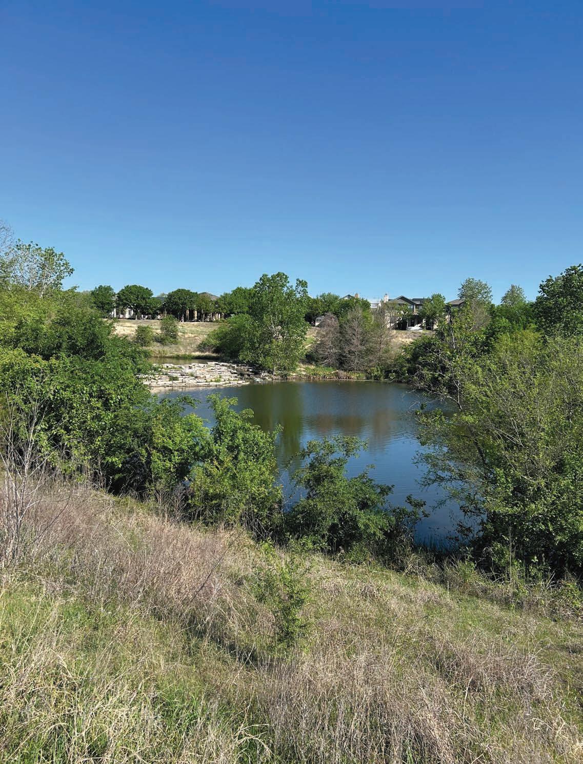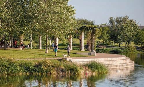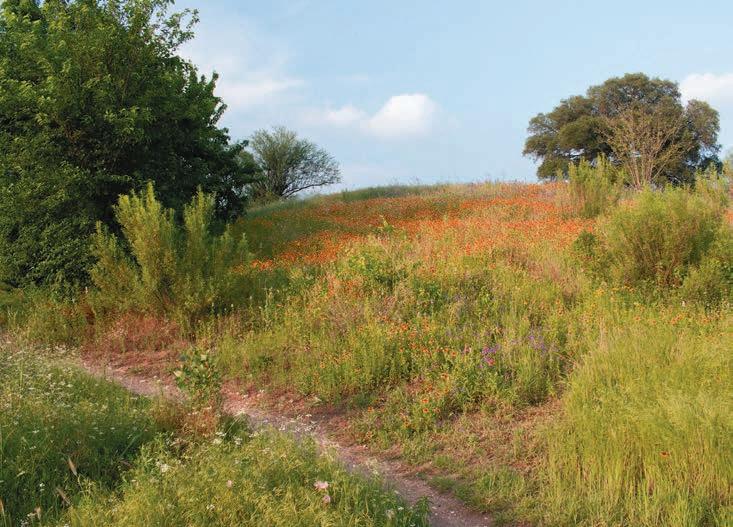 The pond’s form was carefully influenced by the preservation of an existing grove of mature pecan trees, reinforcing a sense of permanence and continuity. Today, it supports both wildlife and recreation, stocked with fish and frequented by catch-andrelease anglers, as well as Great Blue Herons. More than 200 native plant species now thrive throughout the greenway. Beyond their beauty, these grasses and plants contribute to carbon