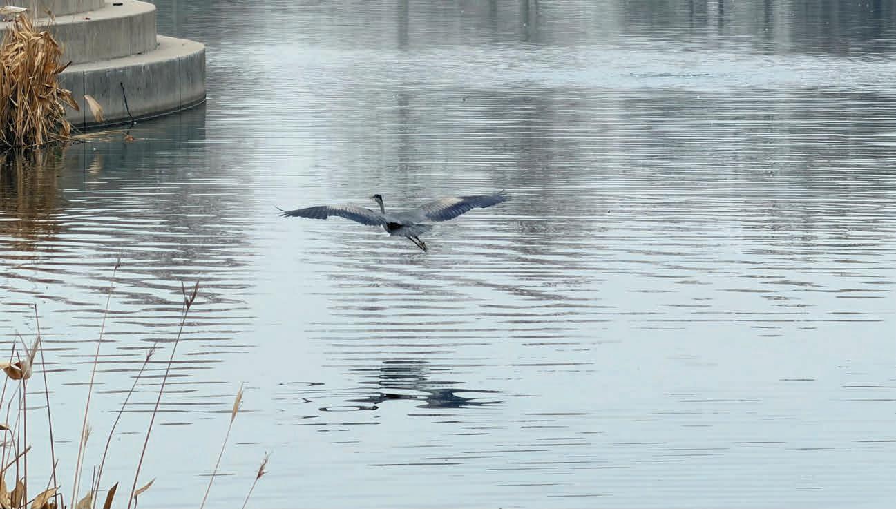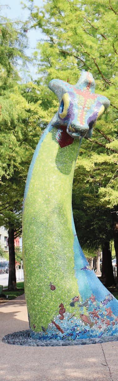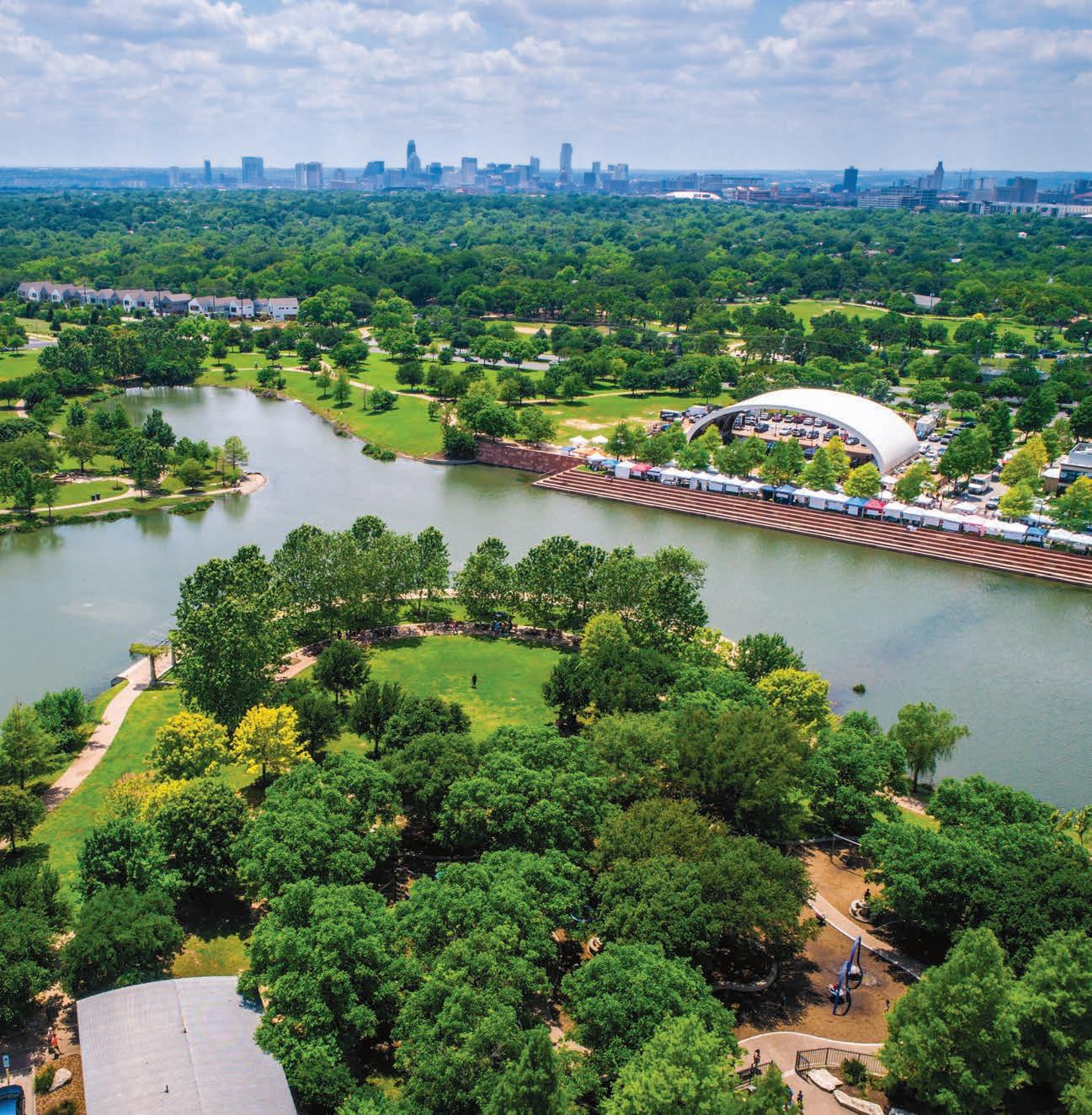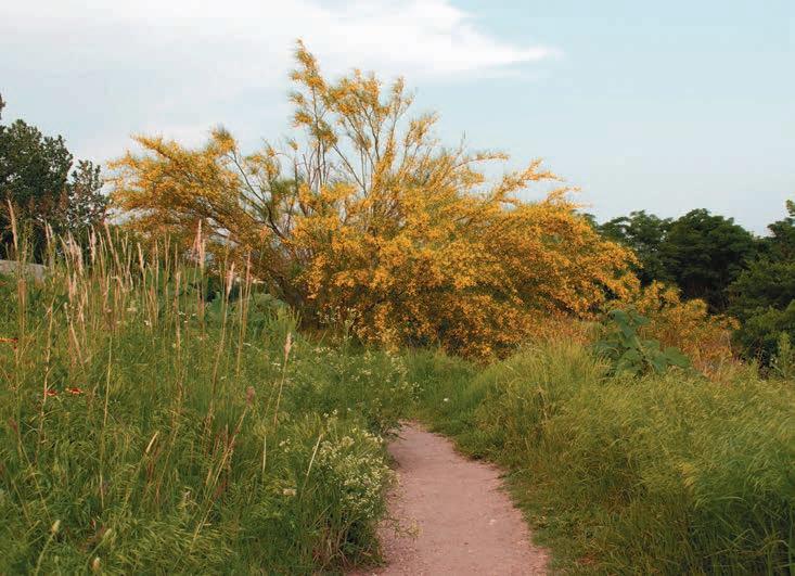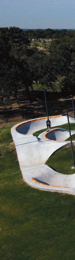 The pond’s form was carefully influenced by the preservation of an existing grove of mature pecan trees, reinforcing a sense of permanence and continuity. Today, it supports both wildlife and recreation, stocked with fish and frequented by catch-andrelease anglers, as well as Great Blue Herons. More than 200 native plant species now thrive throughout the greenway. Beyond their beauty, these grasses and plants contribute to carbon