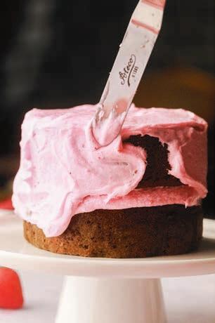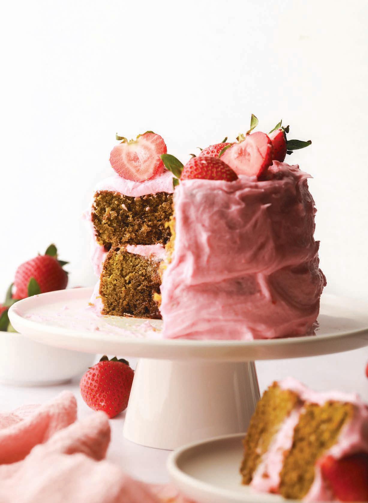 5. Coat the cake with the remaining buttercream using an offset spatula, then finish with a few sliced strawberries.