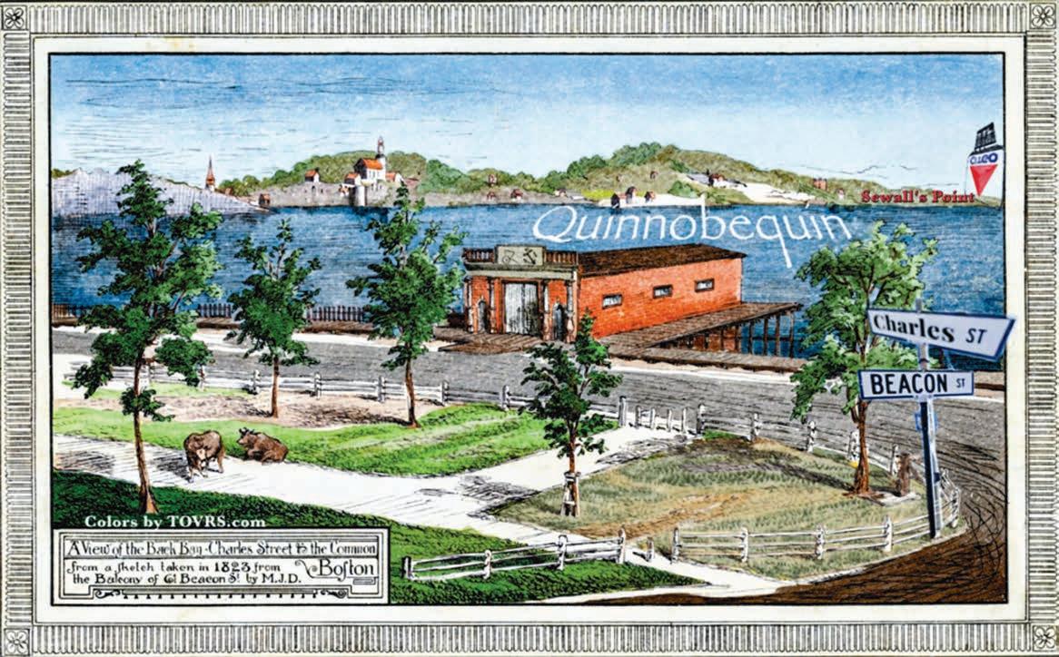 Pronounced “KWIN-OH-BEHKWIN” this Indigenous name for the Charles River translates roughly to “Long-SlowRisingWater-Long.” This wide river was a tidal beast: Twice daily, the water level would rise and fall by 10 feet as Atlantic tide surged around Boston. “Back Bay” was the literal description for the Charles, where it flowed around the backside of the Boston