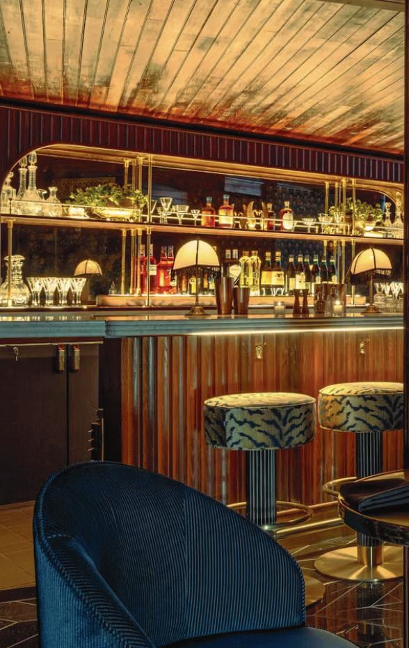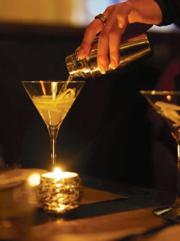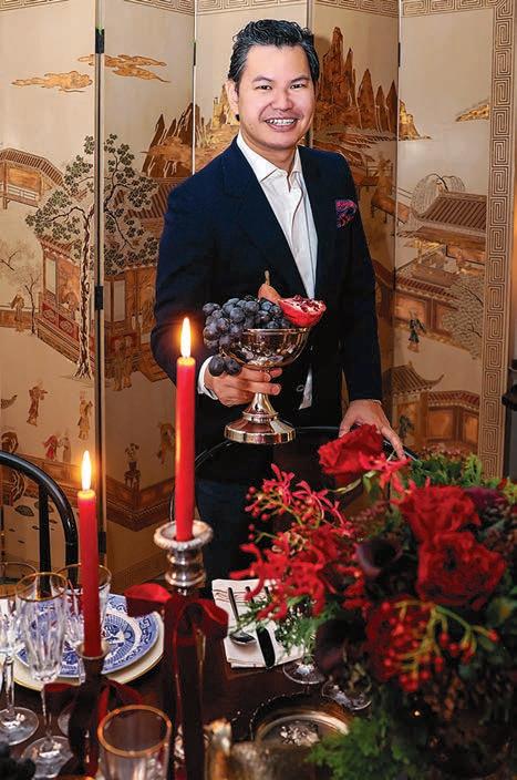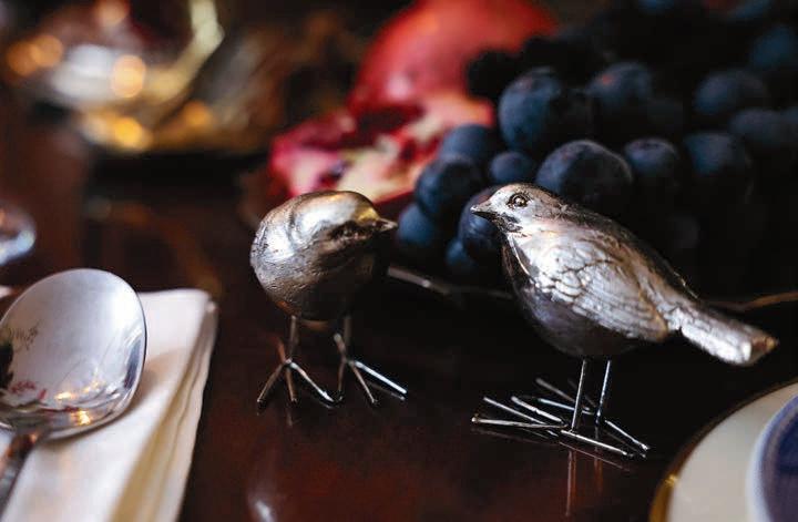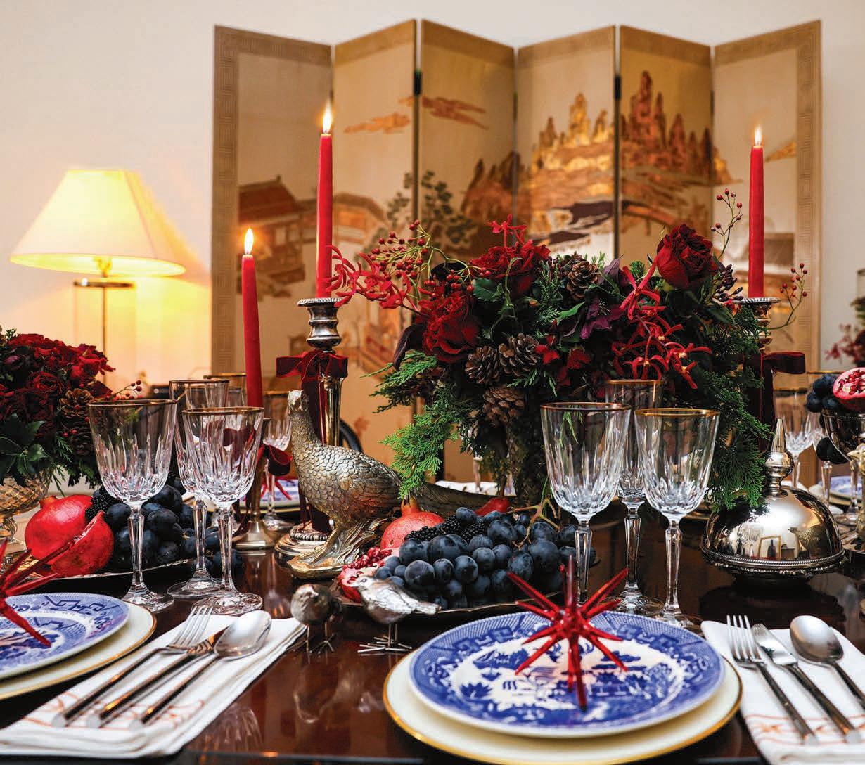 everybody’s mood. I like to accent a room with the various objets d’arts I collect, including my blue Indian peacock taxidermy perched at the bar. Accessories provide an element of richness and a little surprise. Ensure your holiday playlist is tuned in before the first guests arrive. Depending on your theme, it should complement the ambience and never disrupt any of the evening’s conversations. My piano at home makes it easy to play Christmas tunes post-dinner (or perhaps an impromptu sing along after a couple bottles of Champagne). I interpret the fourth sense—touch—here as
