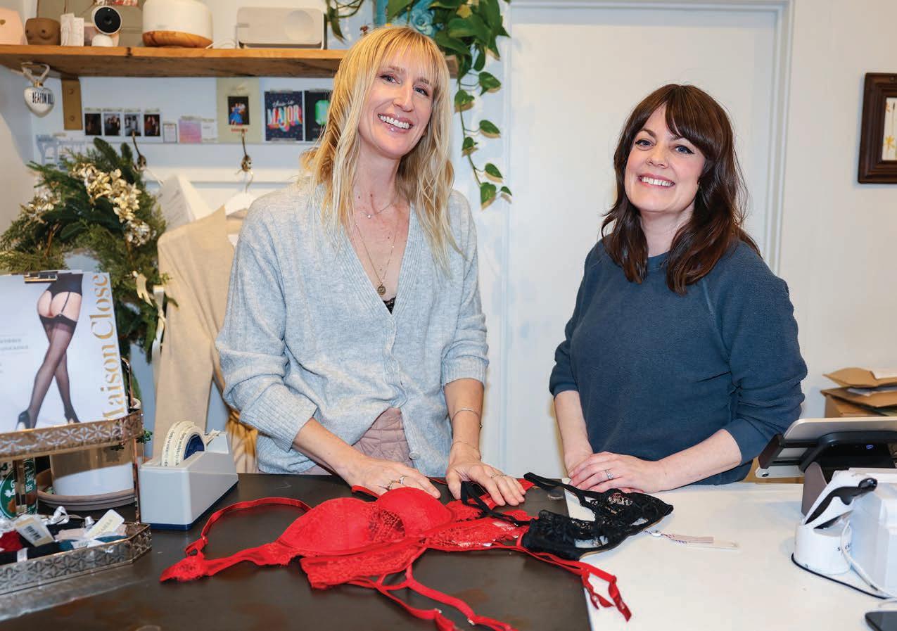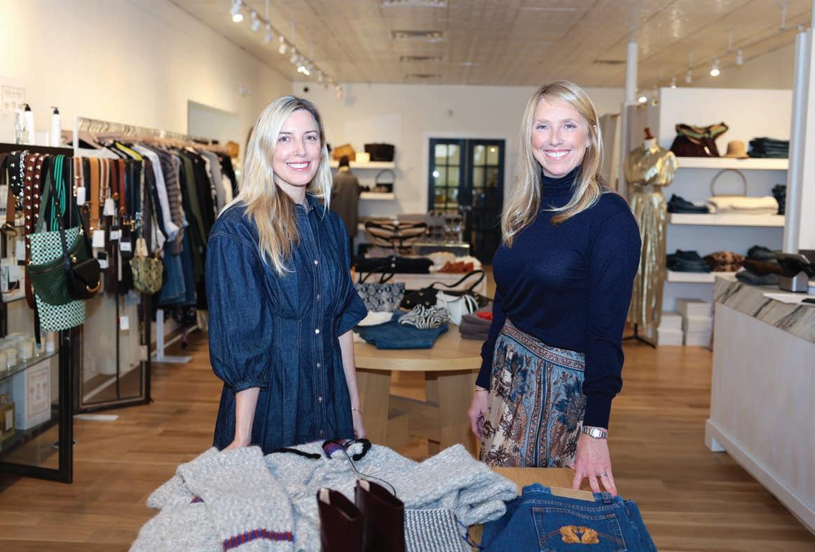 Sitting: Meredith Amenkhienan, wearing a sweater and pants from Crush Boutique and a camisole from Forty Winks. Standing: Rachel Wentworth, wearing a long coat provided by Dress Boston and a dress from Forty Winks