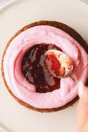 4. To decorate, place one of the cooled cake layers onto a serving board and pipe around the edge to create a border. Fill the center with strawberry jam, then top with the second cake layer.