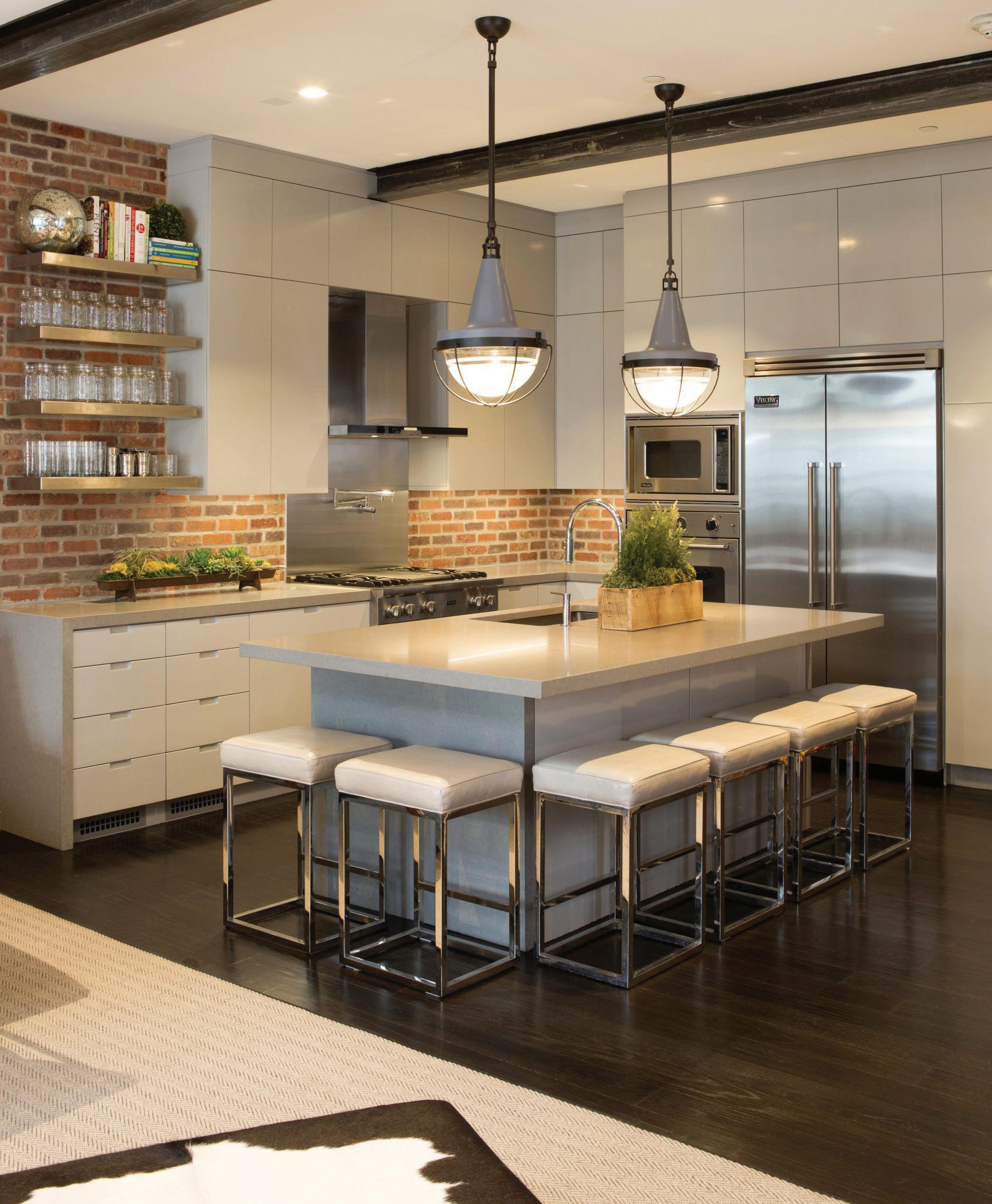 Even the kitchen, perhaps the sparest of the main-floor areas, features stools designed for a modern aesthetic but generously upholstered for comfort. The original kitchen was gutted, and only the appliances were retained. Stainless-steel floating shelves give the space an urban-loft ambiance, along with sleek, flat cabinets painted gray to match the large island.