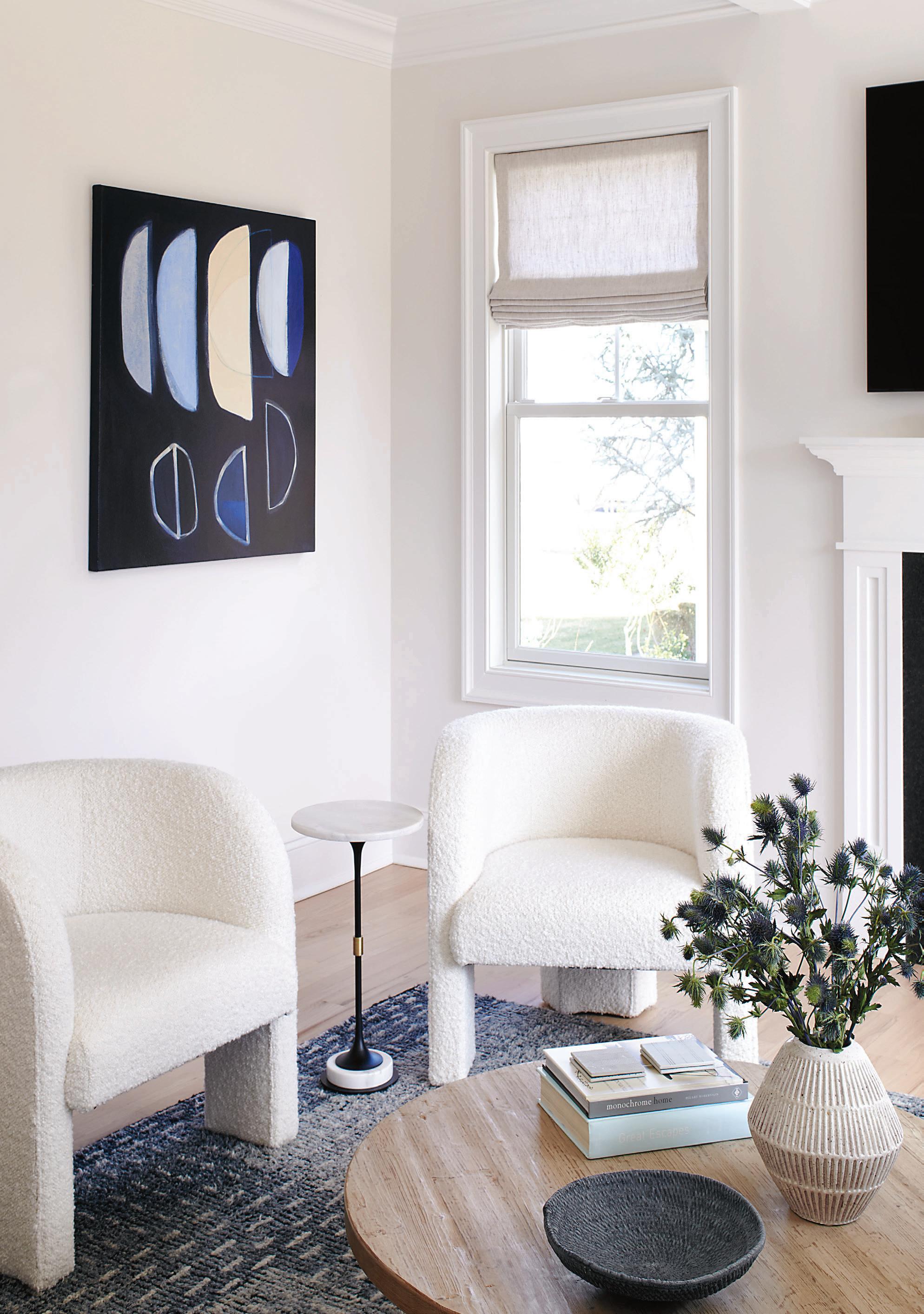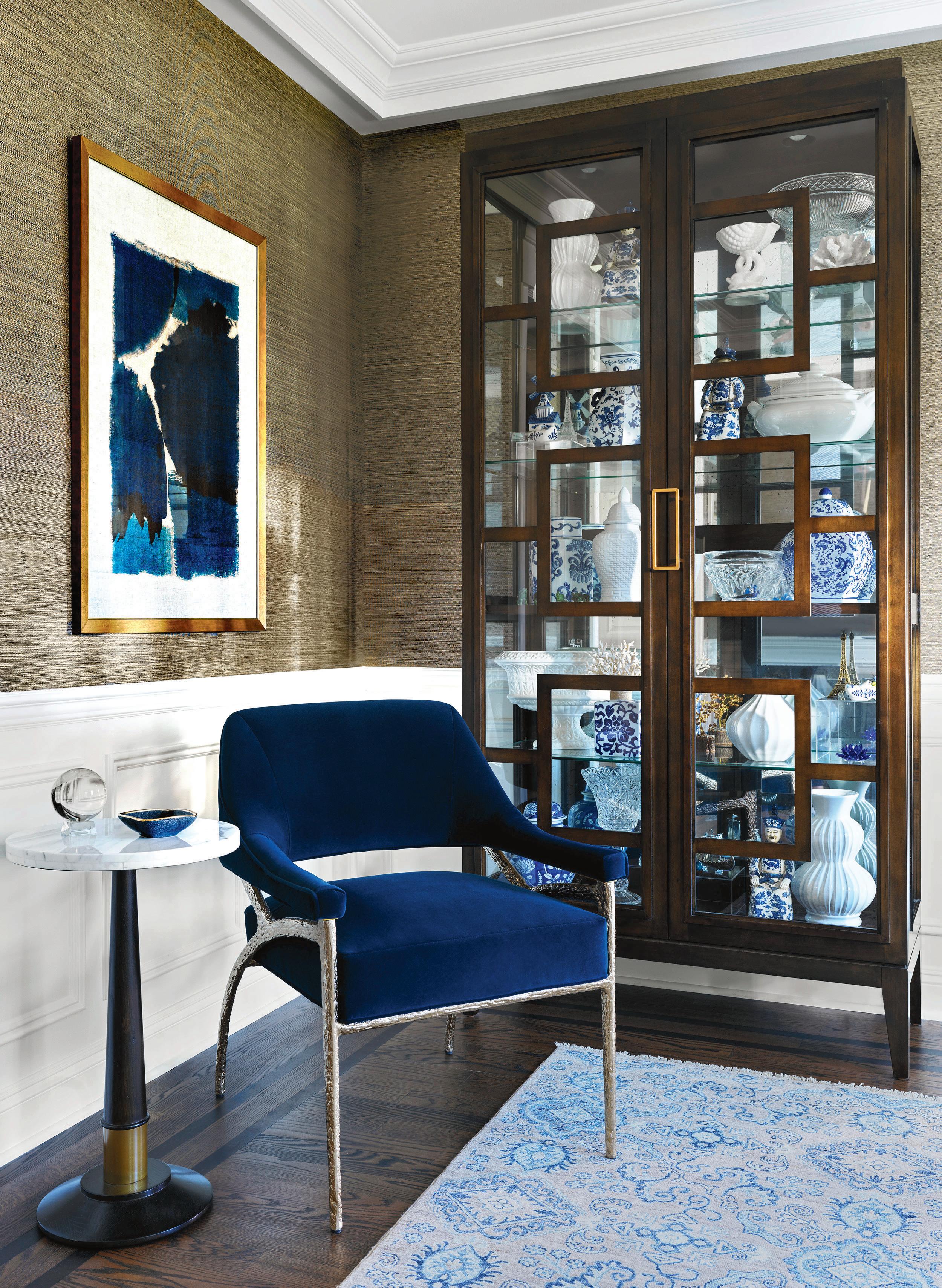 In the living area, she replaced the old red upholstered furniture with a curvilinear, tufted-back sofa in a soft blue velvet and a pair of chairs upholstered in a pale gray performance fabric. The coffee table and side tables all combine glass and metal, and they reflect the light that pours into the room through a series of large windows. Granert installed recessed lighting and painted the walls white, along with the fireplace surround and the built-in bookcases that flank the fireplace. Like the upholstered pieces, the window treatment—woven wood shades under blue-trimmed white curtains— softens the room.