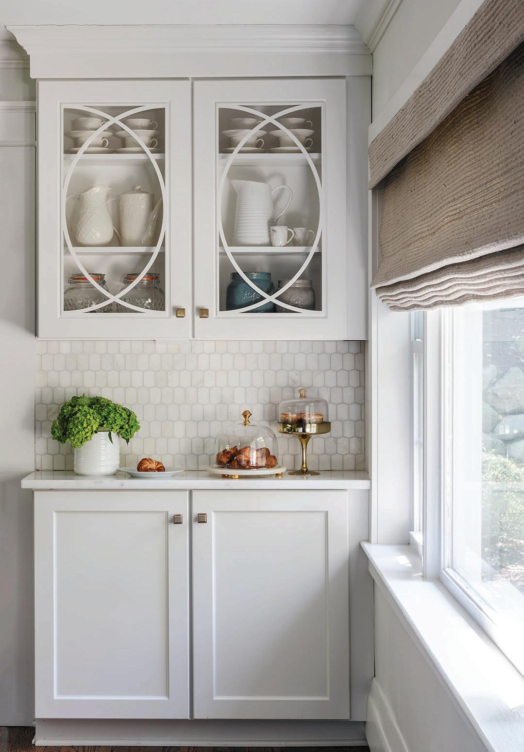 This page: Tea and coffee necessities peek out from a glass-fronted cabinet, part of the coffee bar along with the cabinet and counter below it. A Roman shade of woven wood adds texture to the area. Opposite page: The bright kitchen features white pearl cabinets from Omega Cabinetry and a backsplash of white marble. Transitional-style pendants from Visual Comfort illuminate a pale-gray peninsula topped with quartzite.