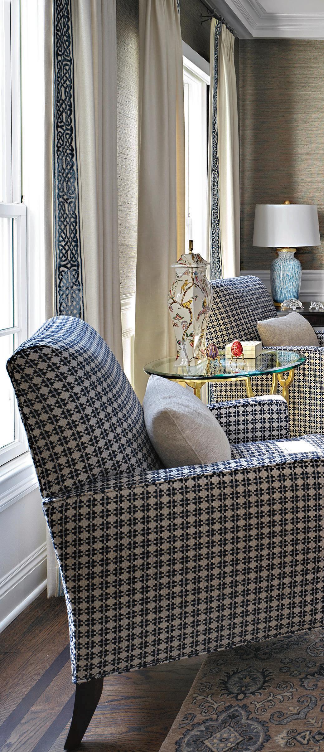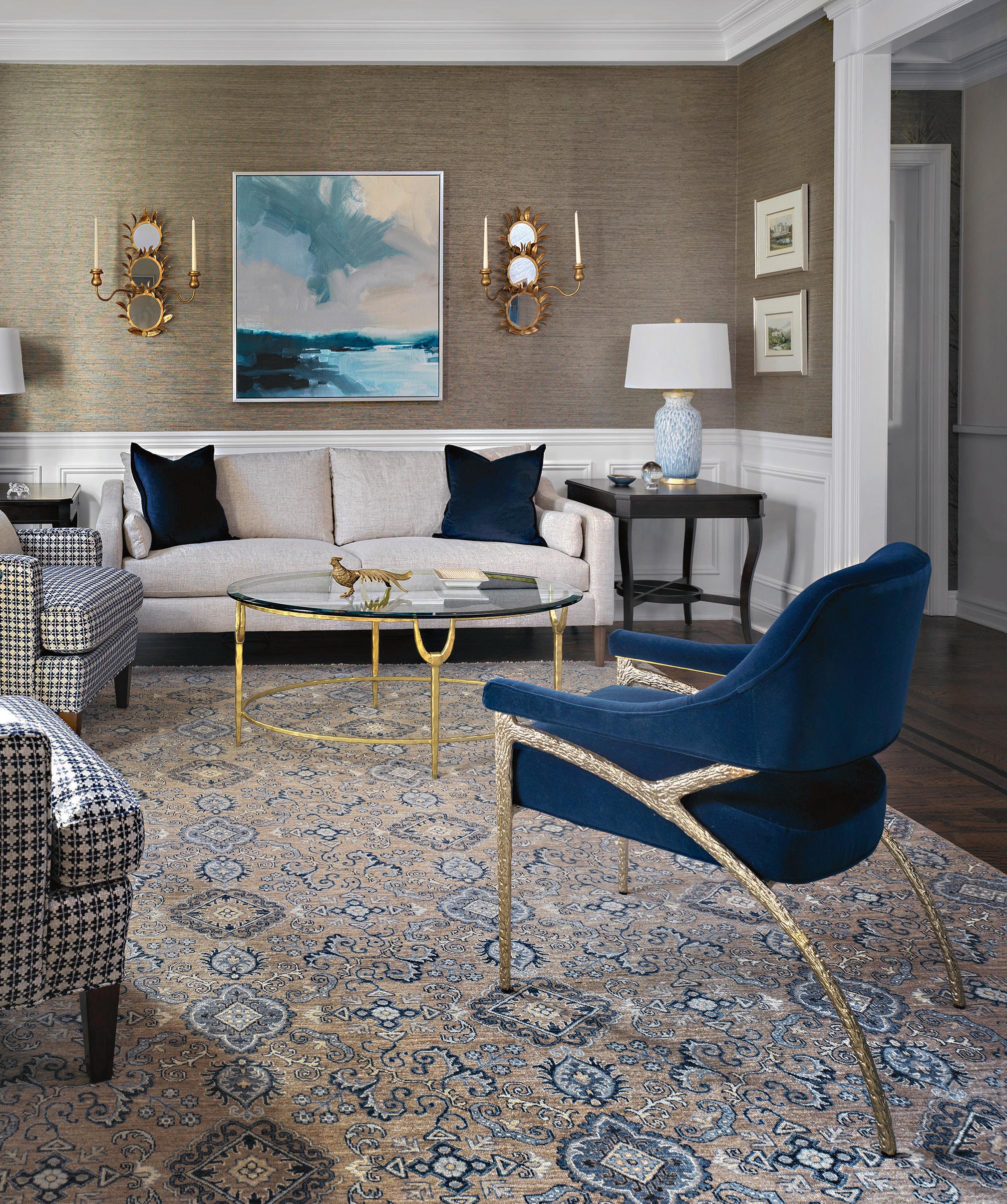 In the living area, designer Linda Granert and homeowner Lori Nuzzi—sisters— wanted to create a light-filled space. That feat was accomplished with Benjamin Moore’s Seapearl paint on the walls and White Dove on the built-ins and fireplace, seating upholstered in soft grays and blues, reflective tables of metal and glass and a pale gray area rug from Jaipur Living sourced through Granert Interior Planning & Design. The layered window treatment of white blue-trimmed curtains against woven wood shades is a favorite touch of the designer.