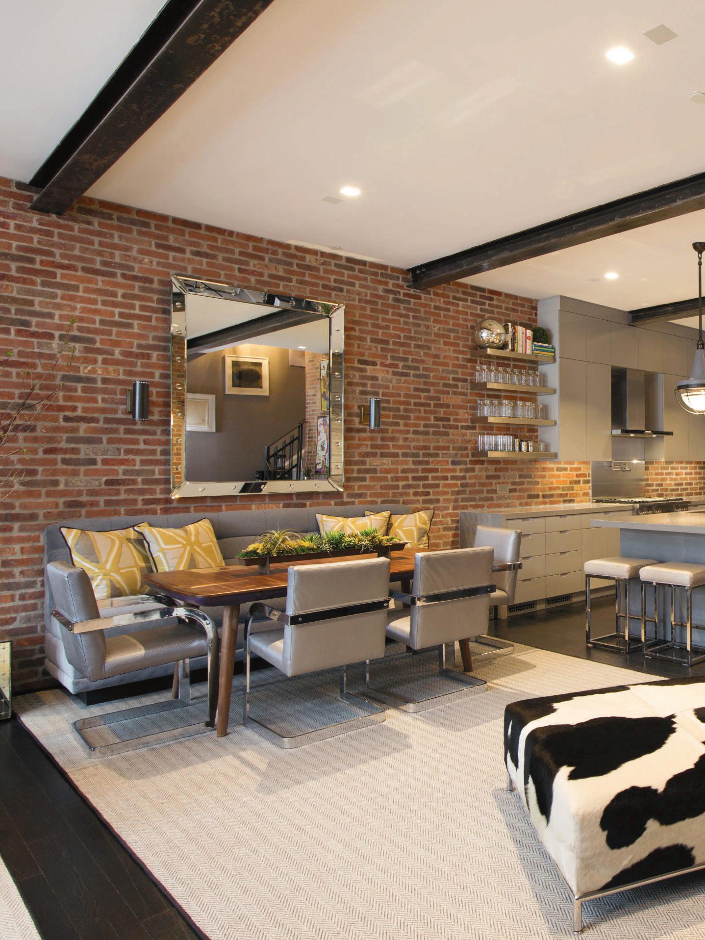 This Princeton townhouse derives its urban ambience from inspired surface treatments like “exposed” brick walls and steel ceiling beams and unusual accents such as a custom cowhide ottoman and an antique Venetian mirror. While the main floor is one expansive space, areas are delineated by flooring choices—for instance, the custom sisal carpet in the dining room from Harcourt, cut to mimic the curve of the stairs. Facing the custom banquette is a table from Team 7 that opens up to seat 16.