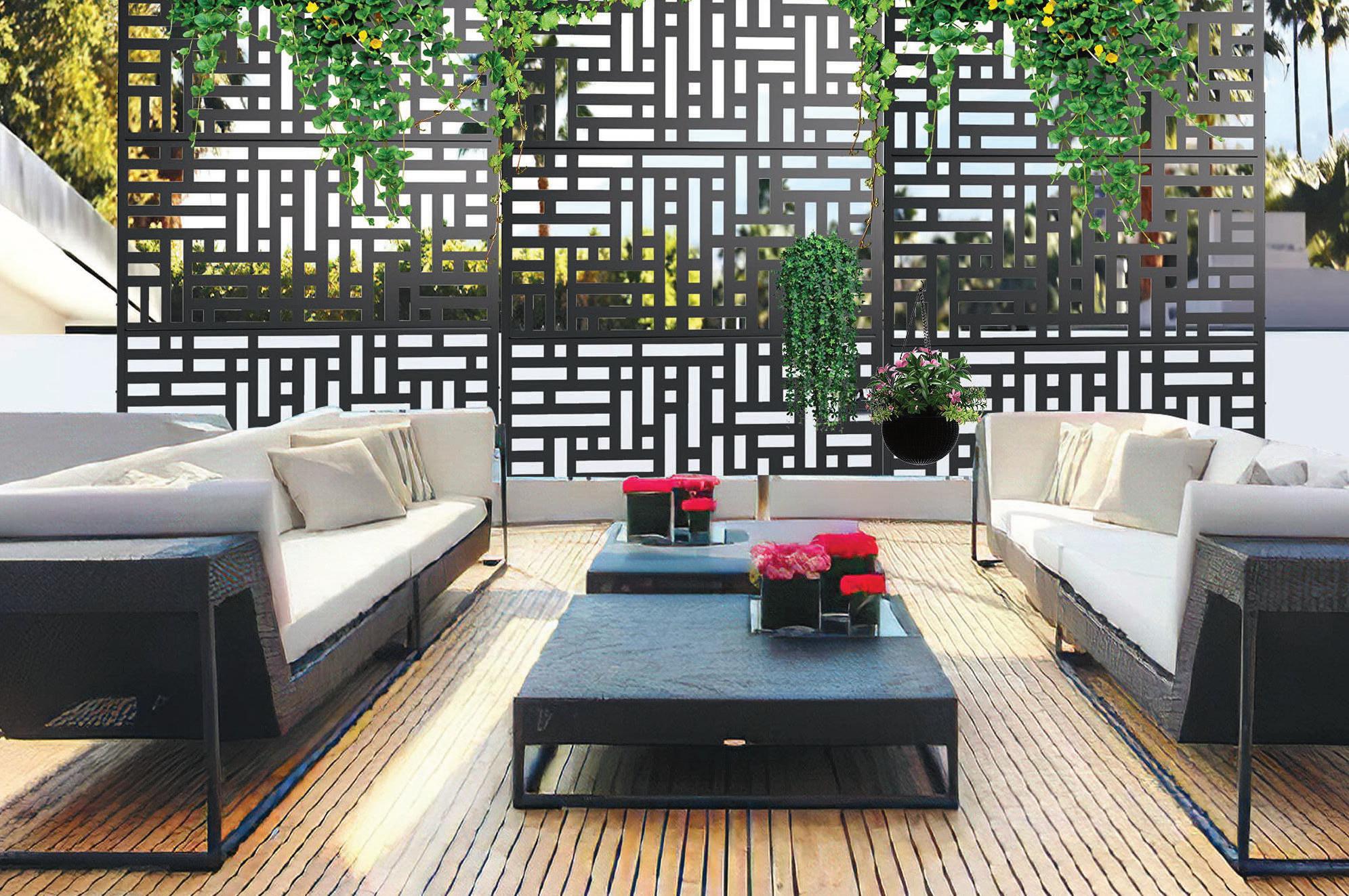 Metal, wood and vinyl are all good partition materials to consider for long-term use—the type you ultimately choose really depends on the look you’re going for. The version shown here is laser-cut black metal, which creates a contemporary look with an intricate design that honors its outdoor location with lush plantings and climbing vines placed at random.
