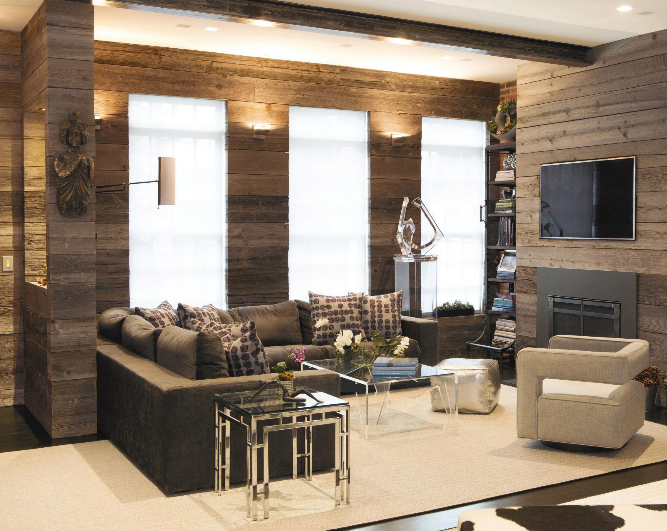 This page: A whimsical painting by Roy Lichtenstein hangs in a niche specifically created to display art. Reclaimed wood adds to the space’s urban feel and allowed the designer to create “hidden” elements such as a disguised powder-room door. Opposite: The living area is contemporary but comfortable, with a sectional built for lounging from Mitchell Black and an upholstered chair and a pair of étagères from Restoration Hardware. Most of the lighting in the open-concept first floor is in the form of can lights and sconces, including a canister sconce from Arteriors.