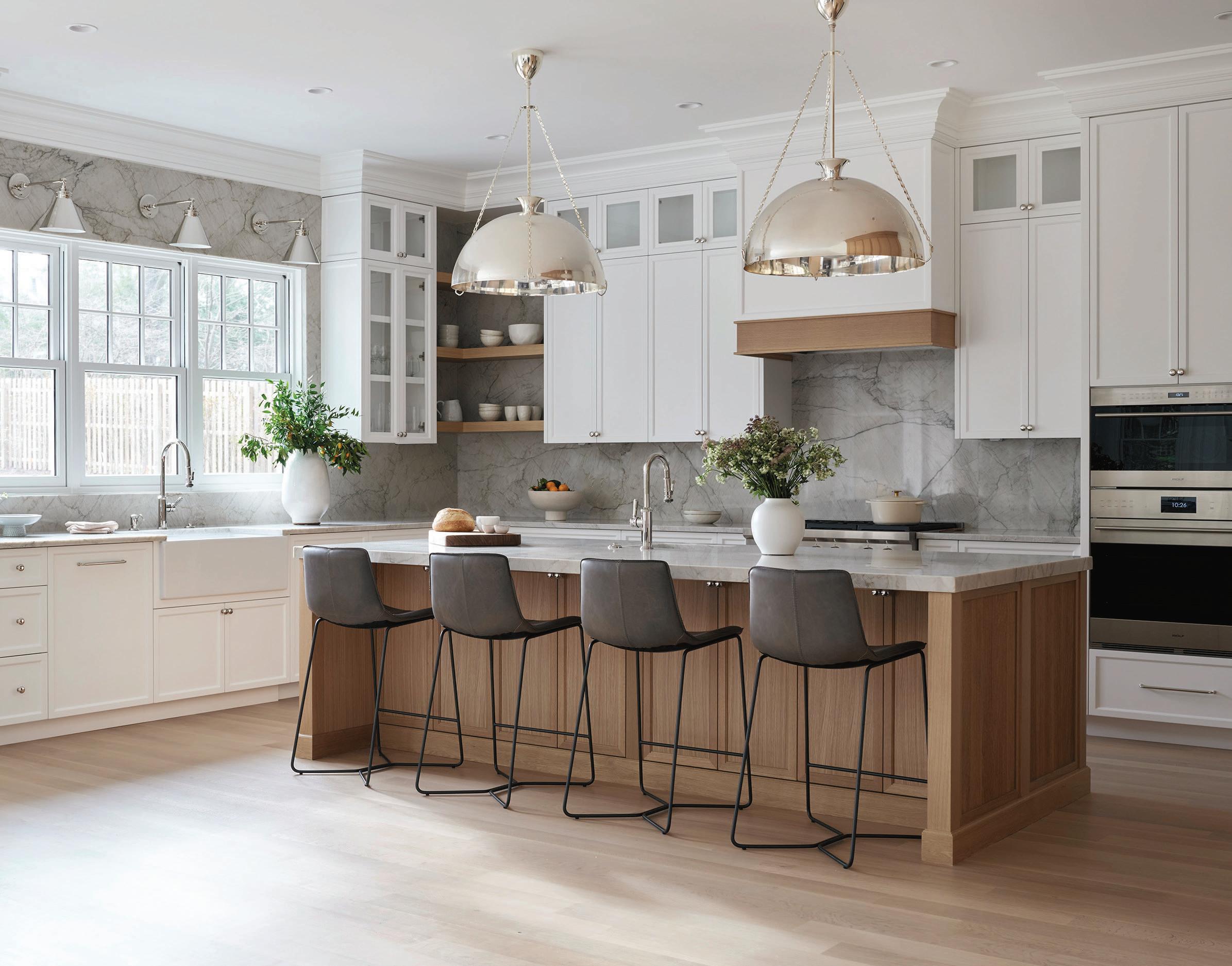 This page: A walnut custom hood is a wondrous wow, but the exotic quartzite island top may be a close second. Opposite page: Open and airy, the new kitchen boasts an updated vibe, including Parisian-style bistro chairs and a herringbone marble backsplash.