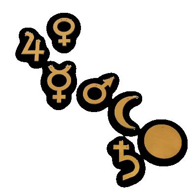 7 goldene Zeichen aus Sperrholz, 8–12 cm, glänzend lackiert. Mit Messingdraht und Anleitung zum Aufhängen an Baum oder Fenster.