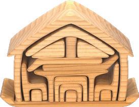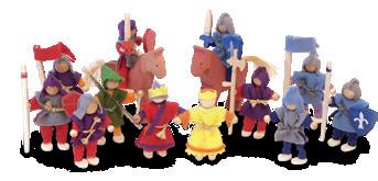 65 Steckteile aus Birkenschichtholz mit Zugbrücke Falltor und Filzfahnen für eine immer wieder veränderbare Spiellandschaft.