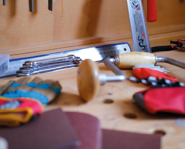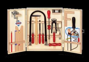 Holzschrank mit 18 Werkzeugen, perfekt sortiert für kreative Holzarbeiten.