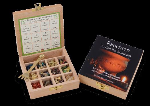 Räuchern in den Raunächten 12 Mischungen aus Kräutern und Harzen im Holzkästchen mit Räucherlöffel. Inkl. Informationen. 12 x 12 x 4,2 cm.