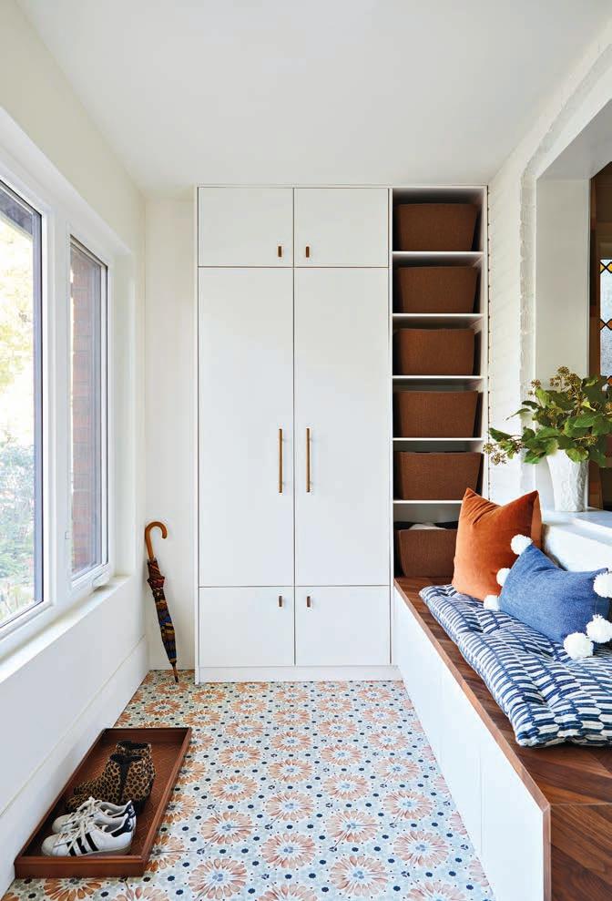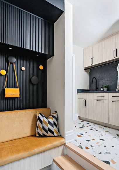 elements from the rest of the house. A quartz countertop and backsplash were introduced to bring a natural stone texture to the laundry area. To add a touch of whimsy and pull together the colours in the space, the designers incorporated Muuto wall hooks. The resulting space is a stylish and functional area that’s perfect for keeping the family organized and on-the-go.
