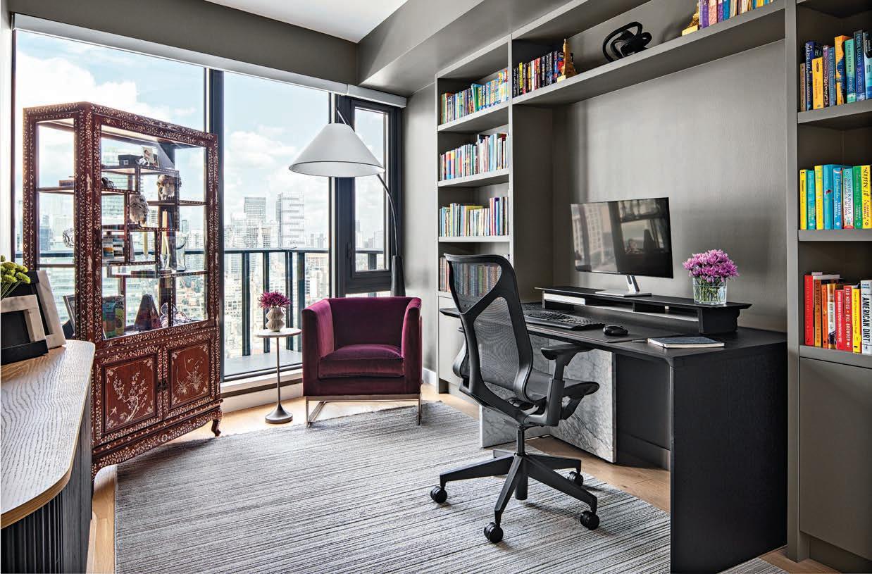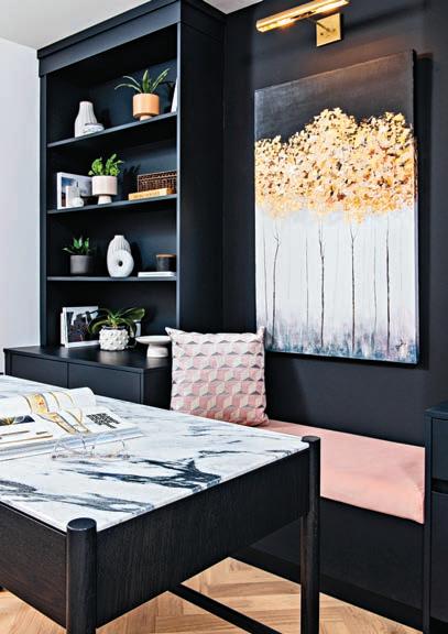 Despite limited space, storage was a crucial element in the home office that was addressed with a custombuilt bookshelf and bench with a little pop of colour in the seat cushion that matches the fun pink leopard print wallpaper on the adjacent wall. The result is a contemporary and functional space that makes working from home a pleasure.