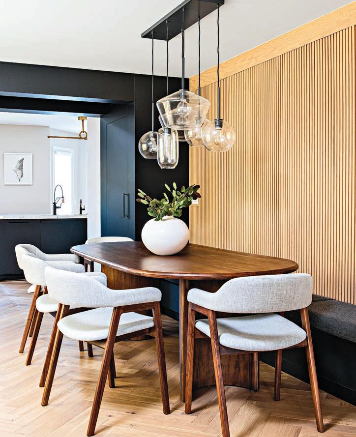 The newly transformed dining room creates the perfect flow for effortless entertaining, seamlessly emerging from the kitchen as a separate, yet unified space. The natural oak reeded wall and custom black bench beautifully lead into the dining room, creating an extension to the kitchen with a cohesive and elegant look. A playful combination of natural textures