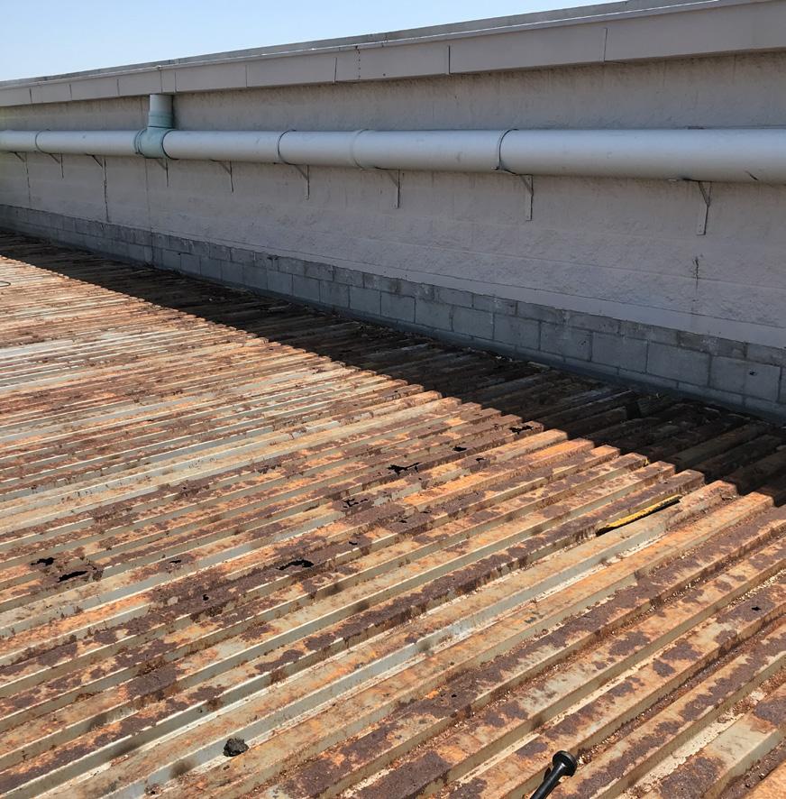| original roof type: BUR | damage: exposed scrim, alligatoring of aging BUR and repair coating, severely corroded structural metal deck | solution: reinforced metal deck and replaced with TPO