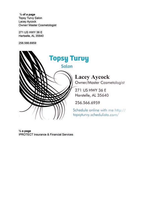 Aycock Owner/Master Cosmetologist 271 US Hwy 36 E Hartselle, AL 35640 256.566.6959 Schedule online with me http://topsyturvy.schedulista.com HalfPage: EddyAutoParts 103WestMoultonStreetDecatur,AL35601 256-355-7922 ScoreboardAd: LynnLaytonChevroletInc. 2416HWY31SP.O.Box1828Decatur,AL35601 HalfPage: EddyAutoParts 103WestMoultonStreetDecatur,AL35601 256-355-7922 ScoreboardAd: LynnLaytonChevroletInc. 2416HWY31SP.O.Box1828Decatur,AL35601 Eddy Auto Parts 103 West Moulton Street • Decatur, AL 35601 256-355-7922 GOOD LUCK LADY LIONS!