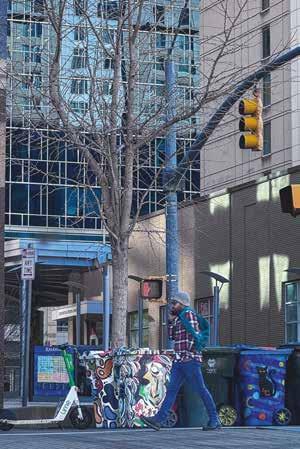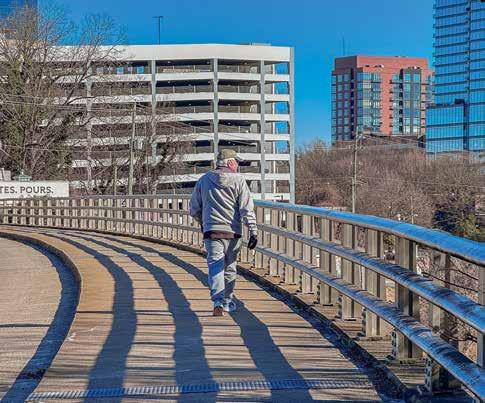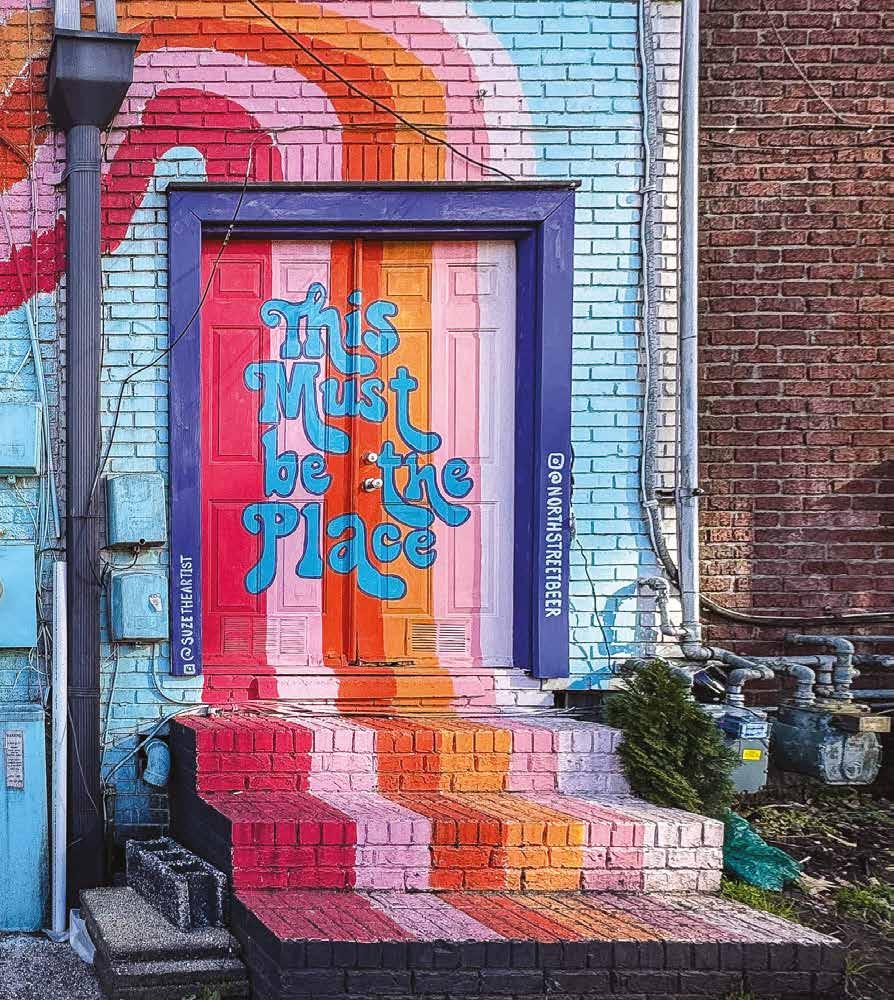 This page, clockwise from top: A walker on Boylan Bridge (Jan. 25); Thomas Sayre’s “Sunflower Power Poles” near Dix Park (Jan. 16); Lisa Gaither’s “Color Pop Corner” mural outside of Marbles Kids Museum (Jan. 26). “This has been photographed so much, so I played with a blur effect to see it differently,” says McEnery. Opposite page: A mural by Suzanne Gasperini O’Hara near Glenwood South (Jan. 2). “I loved the color running down the steps, but also its relationship with the doorway and the pipes,” says McEnery.
