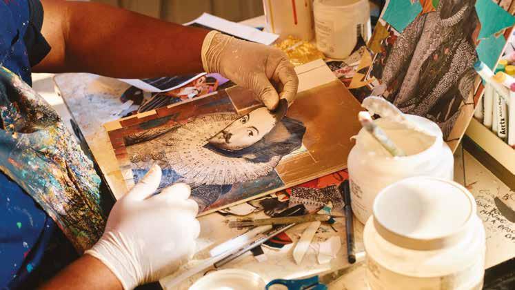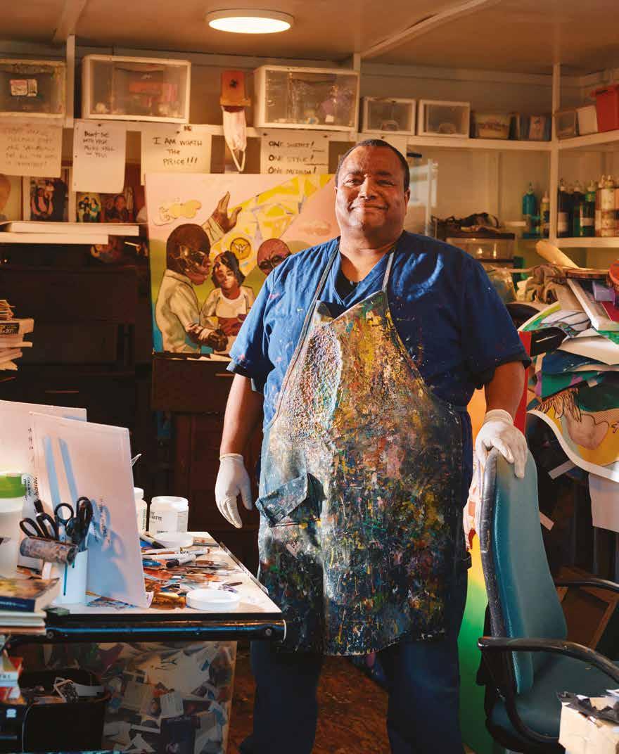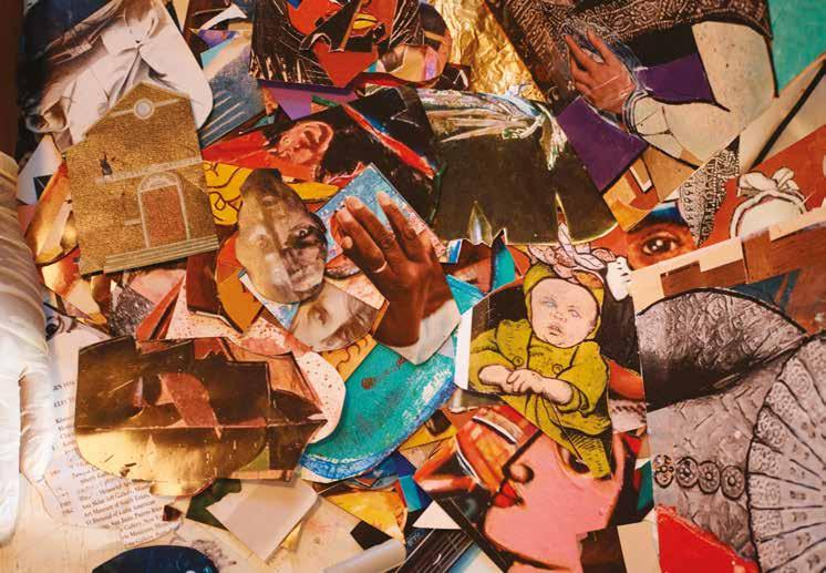 Today, he works from his home studio, where he’s currently working on a series of collages in a visual style reminiscent of one of the most influential AfricanAmerican collage artists, Romare