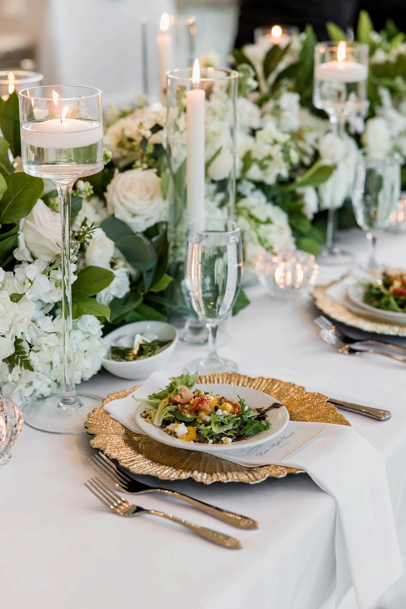 Service Includes: Preset Water, Water and Tea Station, China, Glassware, Silverware, and Polyester Linen Napkins in Black, White, or Ivory.