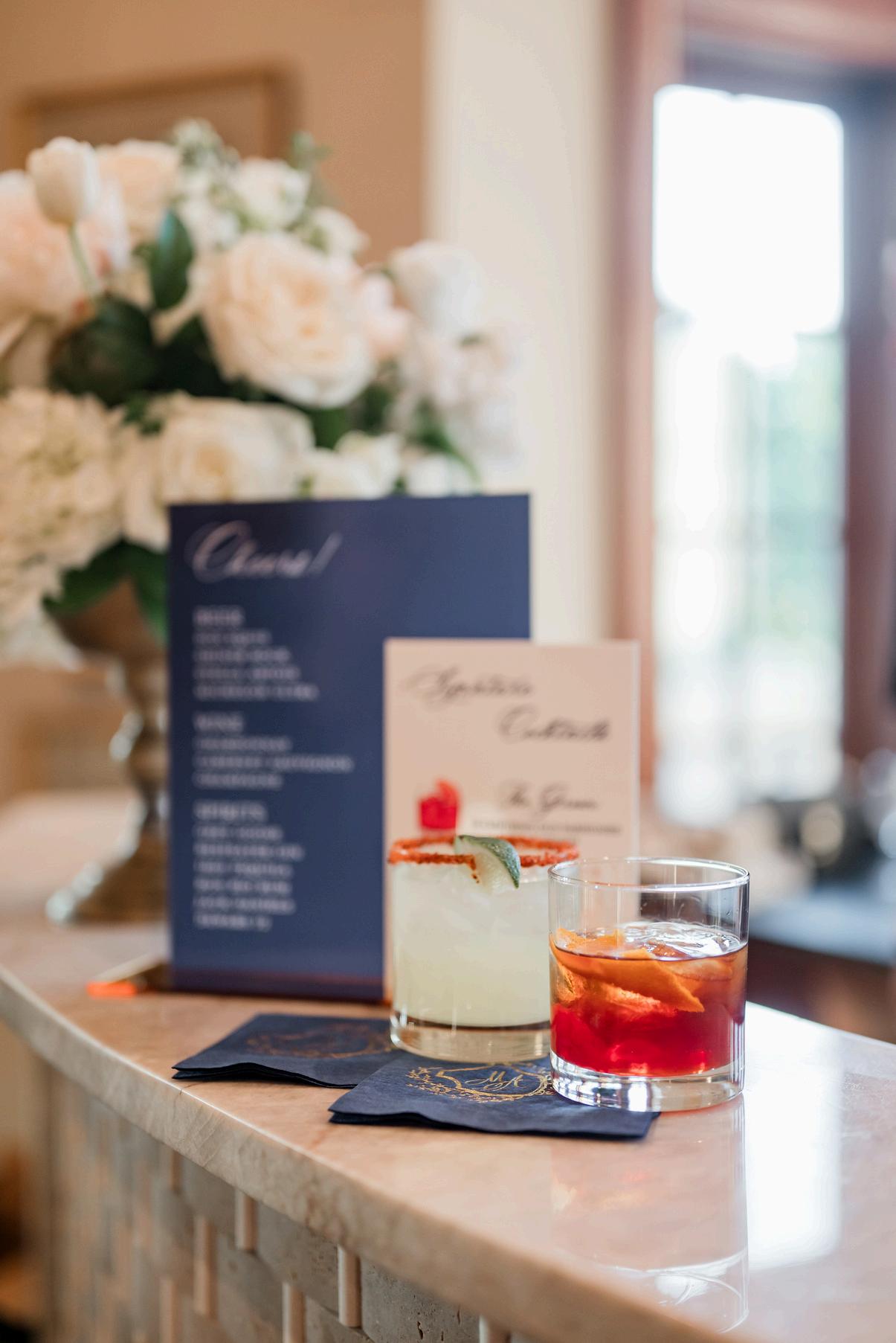 includes 4 hours of full bar service, the following selections, 2 signature drink selections, 3 wine selections, 4 beer selections and passed champagne toast