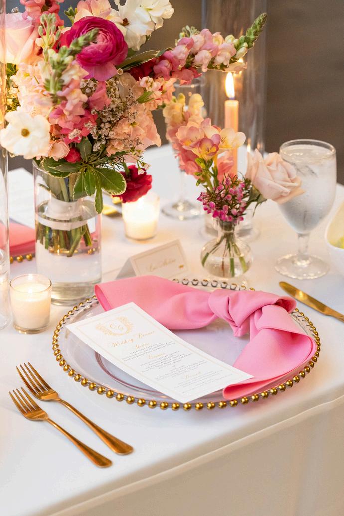 Enhance your reception look with beautiful linens, chargers, and flatware to bring sophistication to your floor plan on your special day
