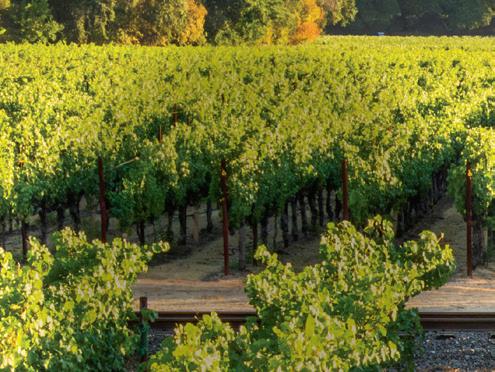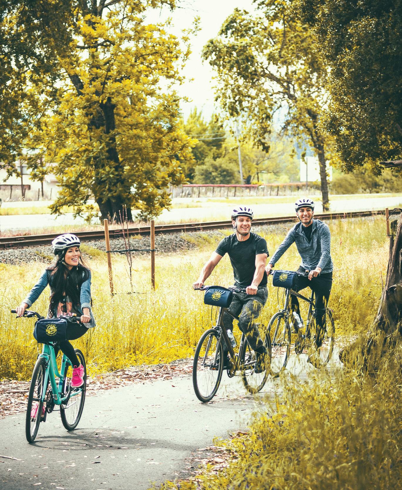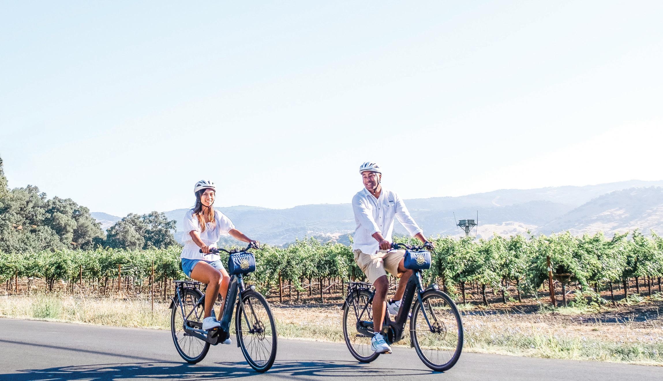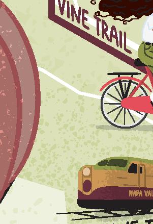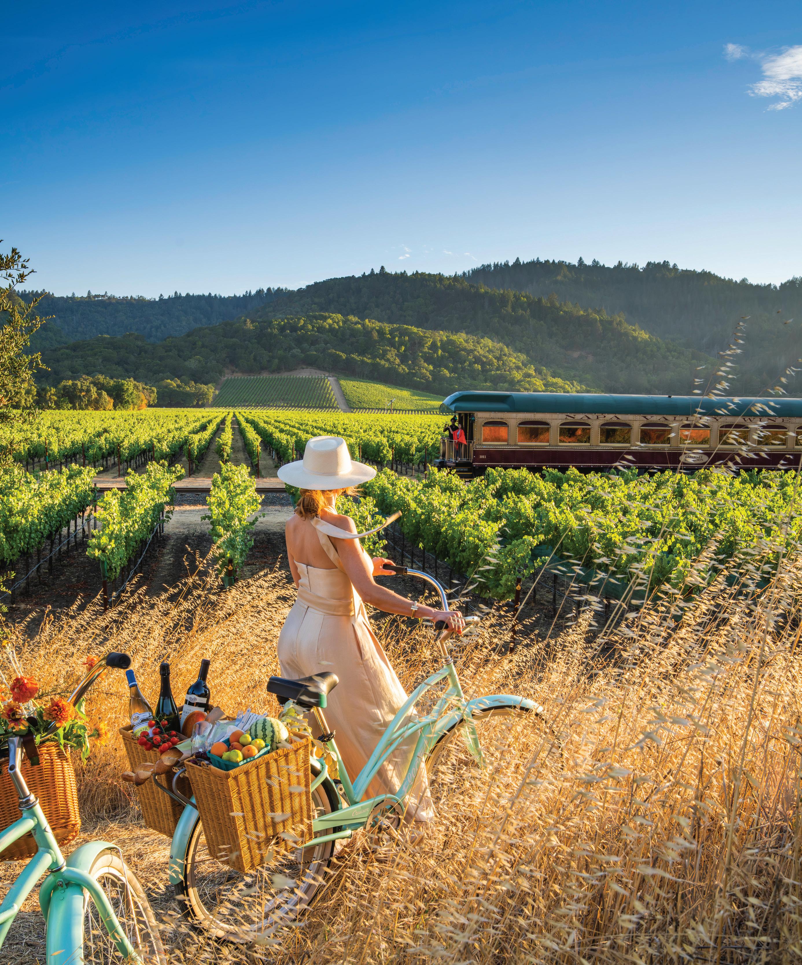 Napa Valley “rush hour,” featuring Napa Valley Wine Train and bikes from Napa Valley Lodge.