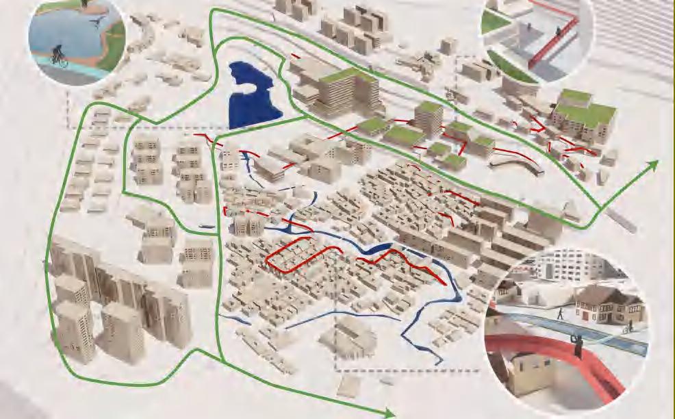 The water system, corridors, and bicycle paths communicate with the functional land in the area. Give the building a new function and enrich the business of the block.
