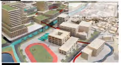 The corridor connects the campus with the external environment, creates a shared campus, shares sports facilities and various service facilities, and strengthens communication between blocks.