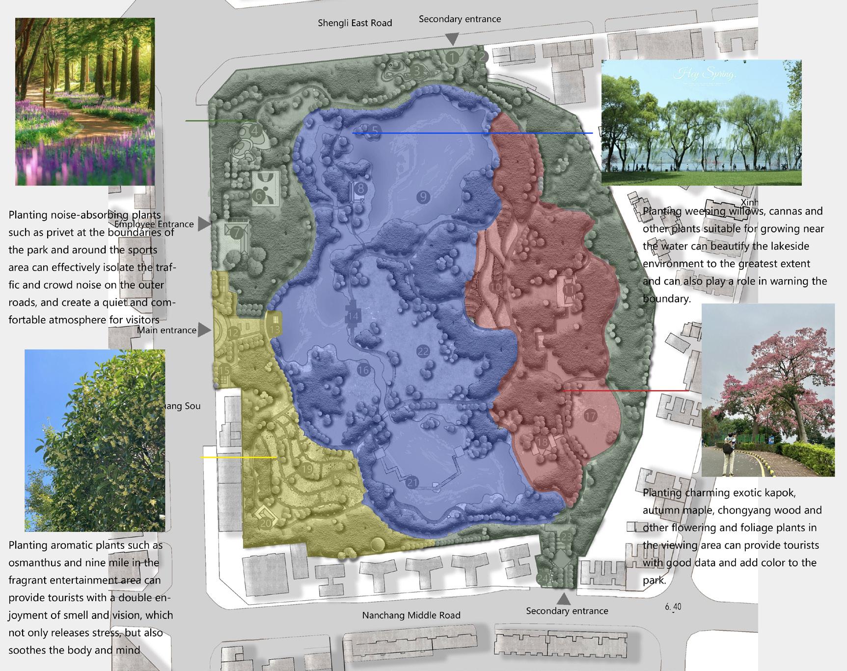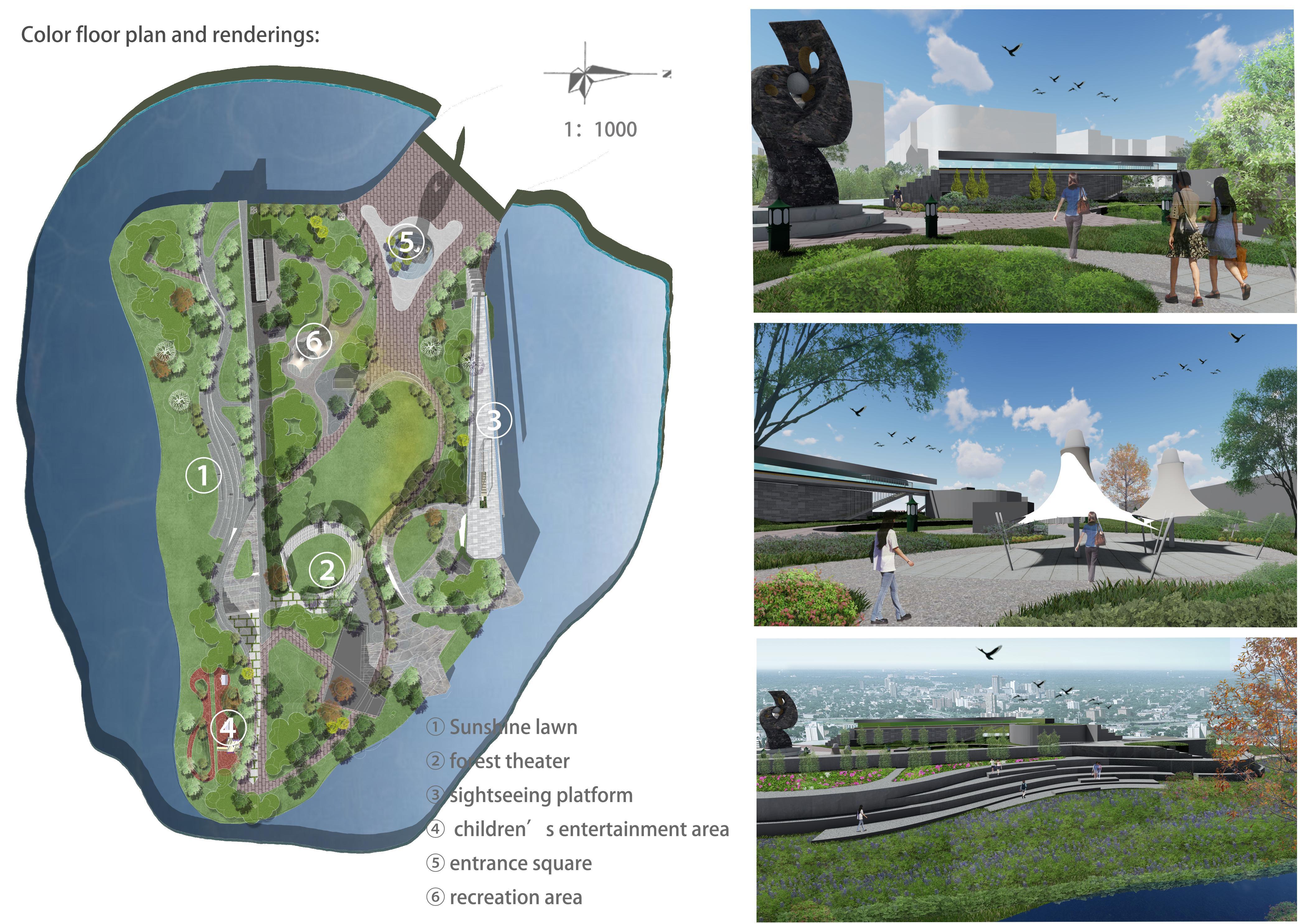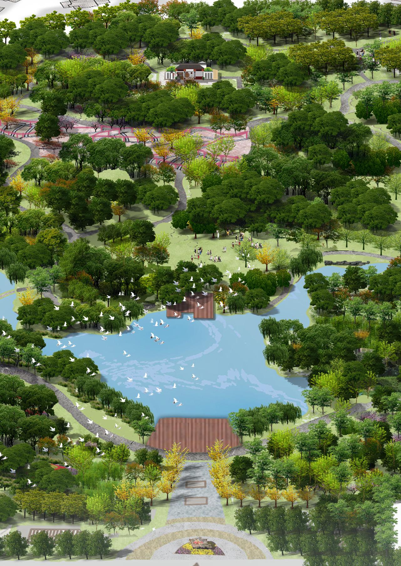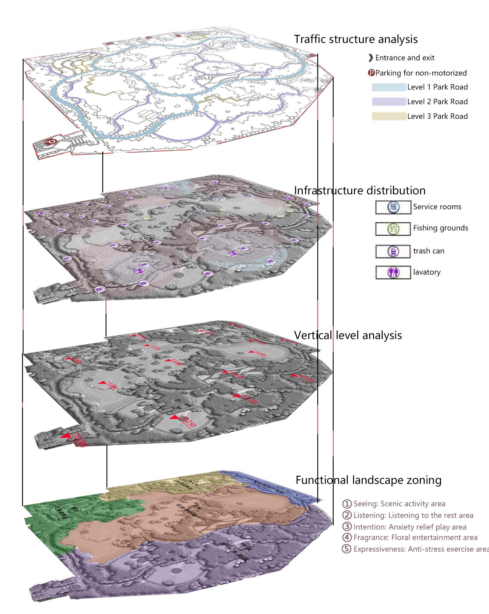The theme of the park is the landscape healing space design under pressure relief, mainly for people with greater social pressure, from the human body's own emotional senses, to provide a place to relieve pressure and relax the body and mind. Starting from vision, hearing, touch and smell, it is divided into "seeing desire", "listening desire", "expressing desire", "incense desire" and "desire", so that people can fully experience the physical and mental feelings brought by the senses, achieve physical relaxation and relieve pressure; Also through landscape construction metaphor life philosophy, express positive energy, guide positive and healthy psychology. Through the special plastic and cultural exhibition and interactive area, the cultural dynamic activity area is set up to create an urban green lung of cultural symbiosis.