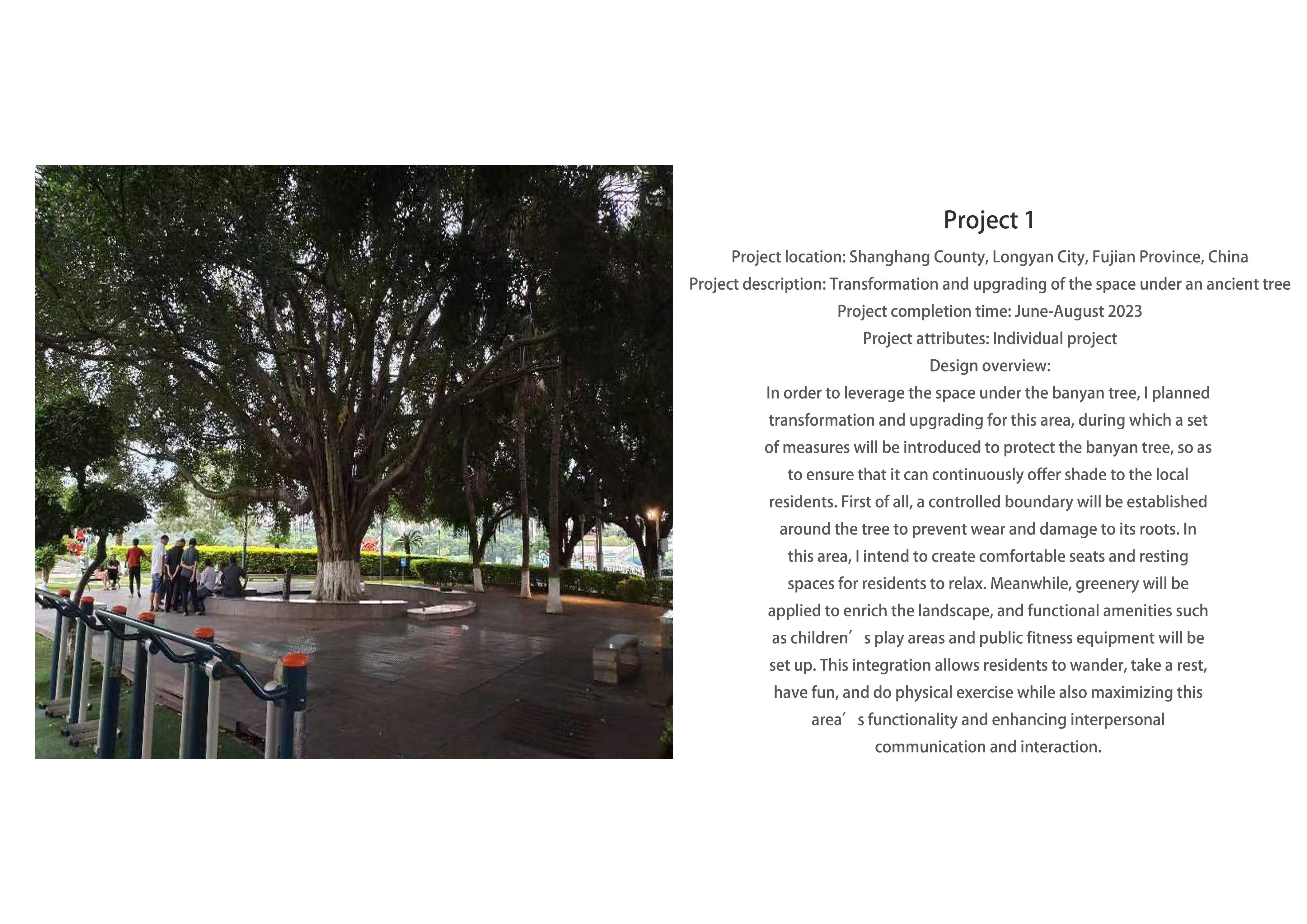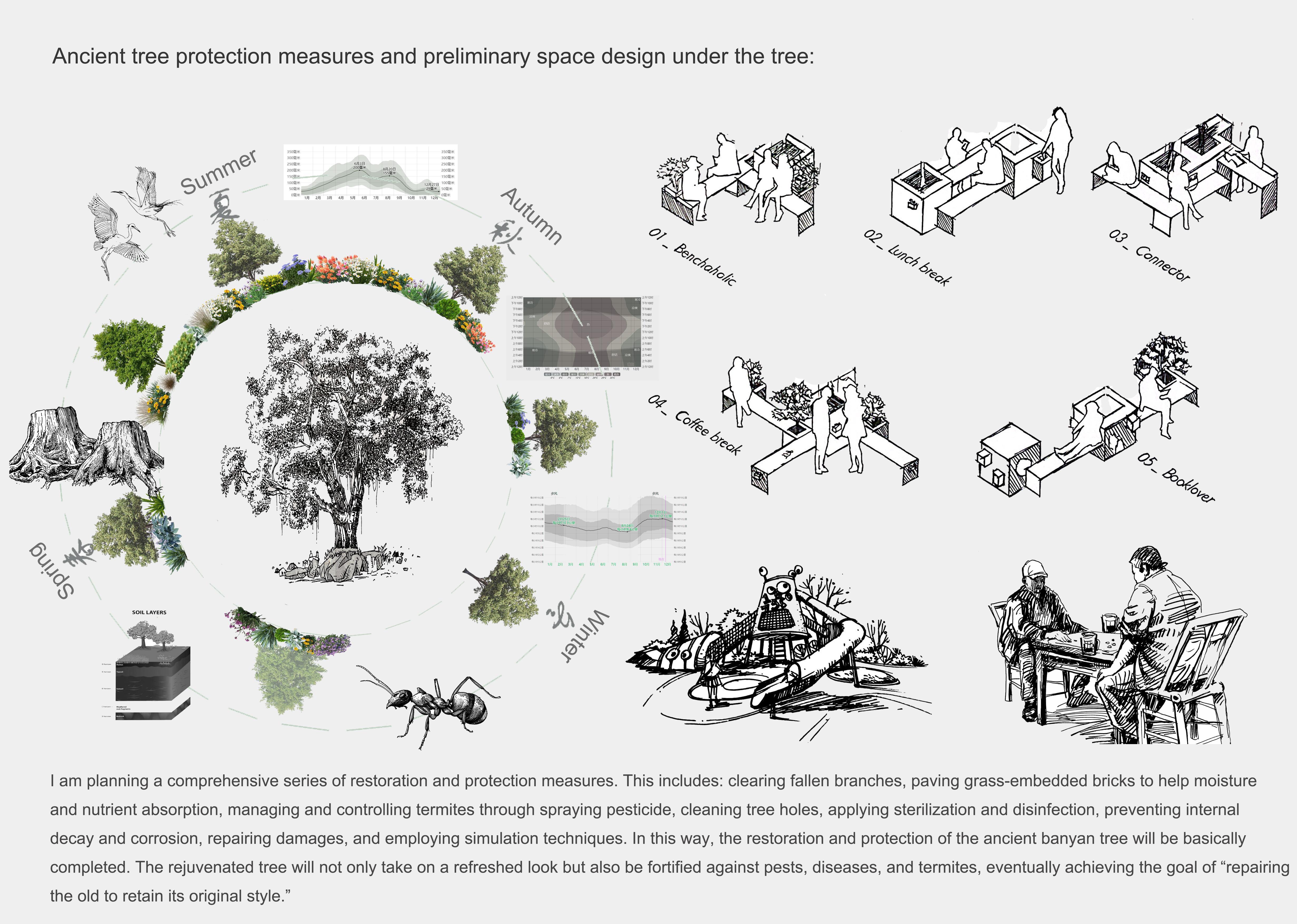 First of all, the circumference of the tree is limited to avoid wear and damage to the root system of the banyan tree. In this area, by adding chairs and resting spaces, it provides an ideal place for surrounding residents to rest. Each chair will be made of comfortable materials. At the same time, we will add some greenery to enhance the landscape effect. Functional amenities such as children's play areas and communal gym equipment have also been added. Here, residents can walk, rest, have fun and exercise. These facilities not only enrich the functionality of the area, but also promote communication among residents and community interaction.