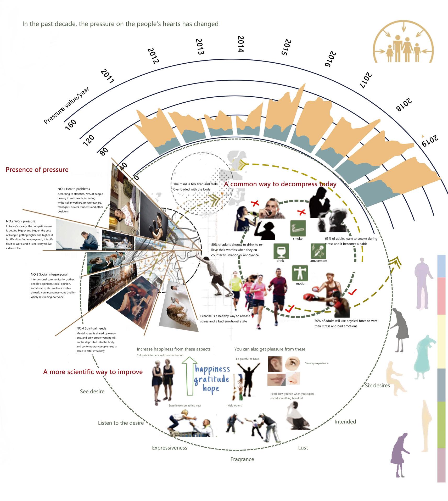 This design takes relieving people's mental pressure as the starting point, starting from five elements of "seeing desire", "listening desire", "expression desire", "fragrance desire" and "desire", endosing space with healing functions such as relieving emotions, relaxing social interaction and reducing pressure, and building a rich space type that meets people's emotional needs and stimulates natural vitality.