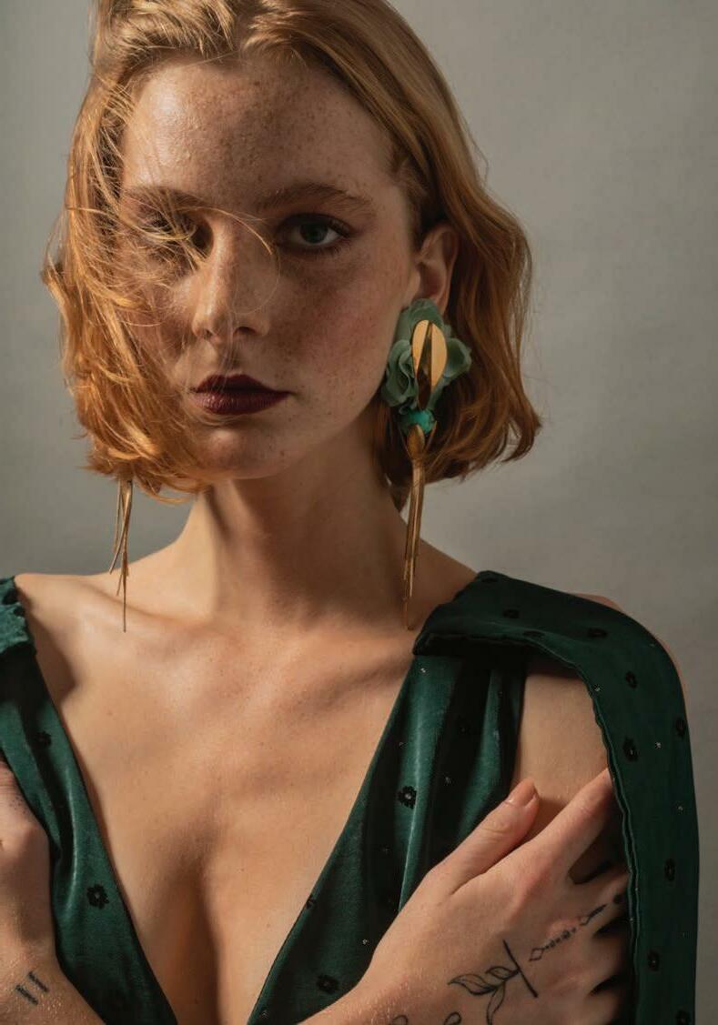 ...and wonderful jewellery. Vera Manzoni is a true originator, making a statement with every piece. Left: gold-plated metal earrings with fabric flower and turquoise stone, €40. Above right: printed wood butterfly earrings, 9cm in length, with turquoise and brass detail, €40. veramanzoni.com