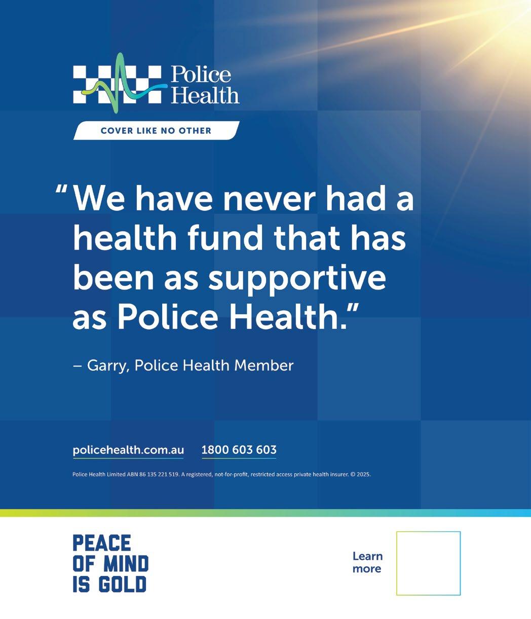 DISCLAIMER WAPU (“Publisher”) advises that the contents of this publication are the sole discretion of the WA Police Union and the magazine is offered for information purposes only. The publication has been formulated in good faith and the Publisher believes its contents to be accurate, however, the contents do not amount to a recommendation (either expressly or by implication) and should not be relied upon in lieu of specific professional advice. The Publisher disclaims all responsibility for any loss or damage which may be incurred by any reader relying upon the information contained in the publication whether that loss or damage is caused by any fault or negligence on the part of the Publishers, its Directors or employees.